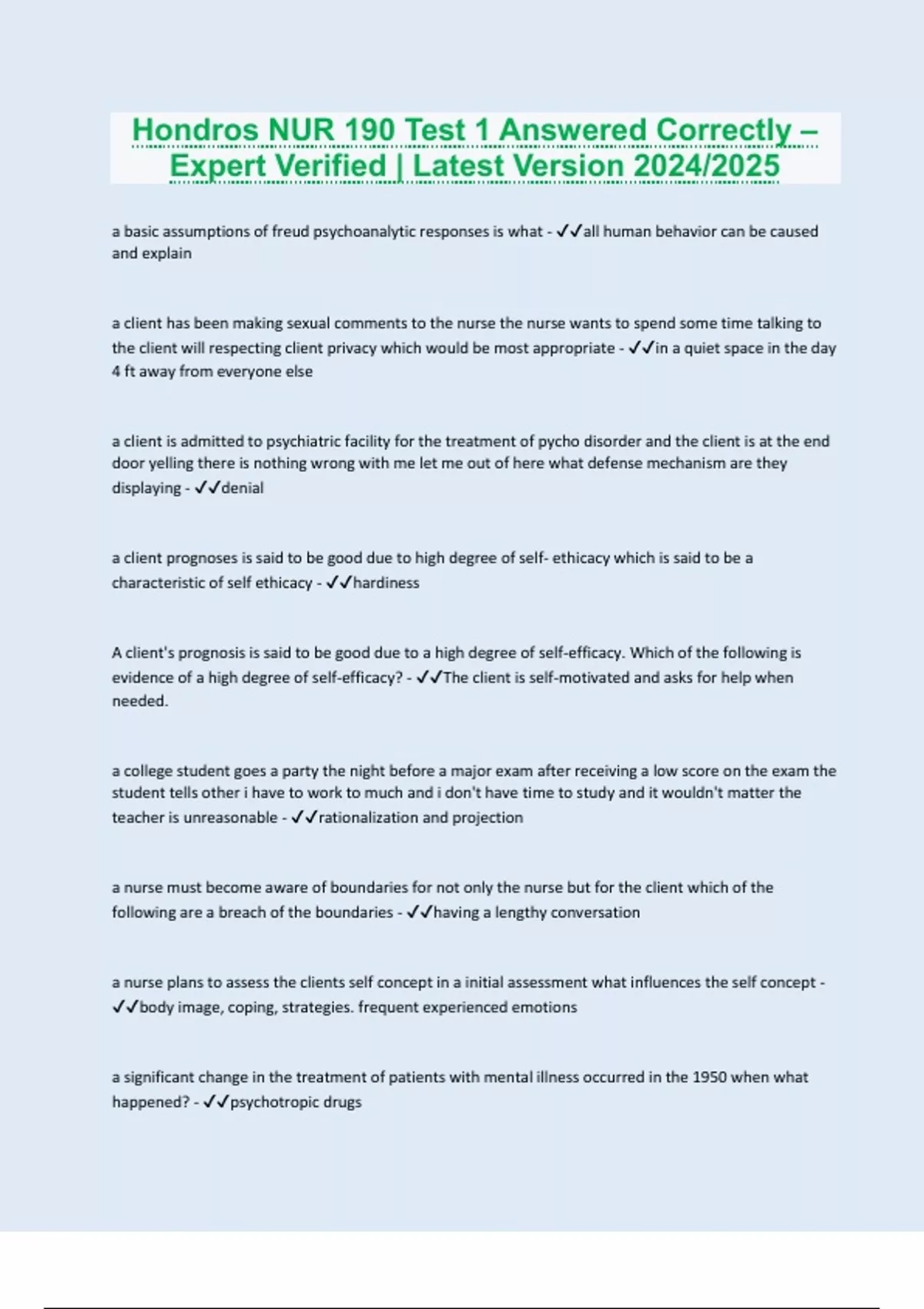 Hondros NUR 190 Test 1 Answered Correctly – Expert Verified | Latest Version 2024/2025