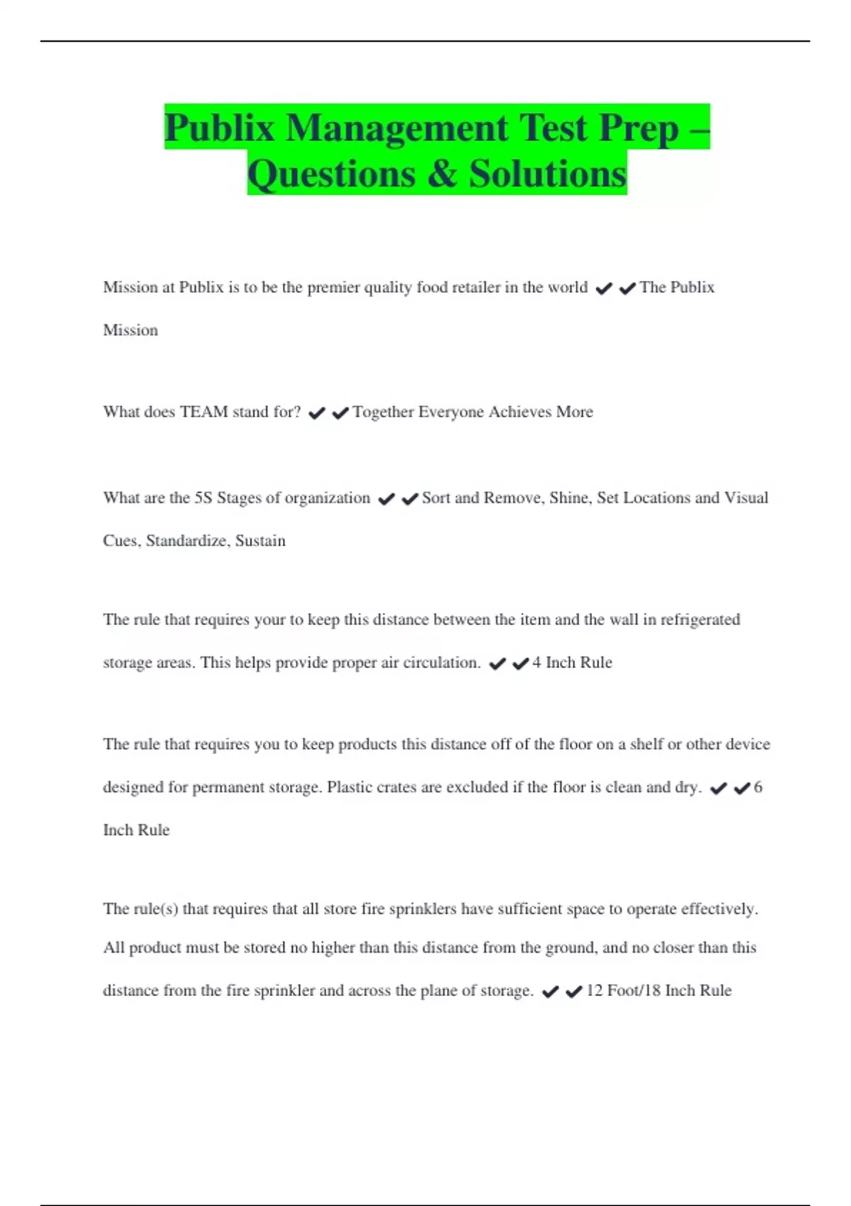 Publix Management Test Prep – Questions & Solutions Mission at Publix is to be the premier quality food retailer in the world ️️The Publix Mission What does TEAM stand for? ️️Together Everyone Achieves More What are the 5S Stages of organization ️️Sort and Remove, Shine, Set Locations and Visual Cues, Standardize, Sustain The rule that requires your to keep this distance between the item and the wall in refrigerated storage areas. This helps provide proper air circulation. ️️4 Inch Rule