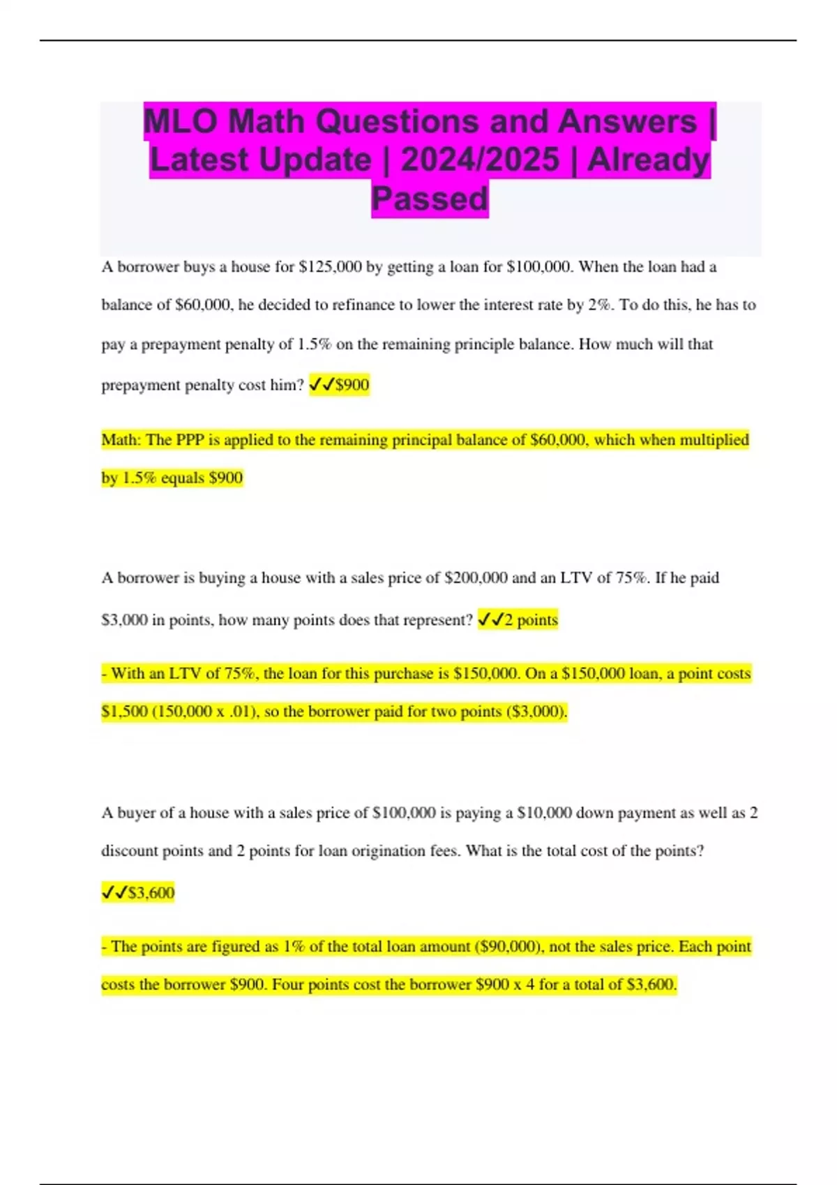 MLO Math Questions and Answers | Latest Update | 2024/2025 | Already Passed A borrower buys a house for $125,000 by getting a loan for $100,000. When the loan had a balance of $60,000, he decided to refinance to lower the interest rate by 2%. To do this, he has to pay a prepayment penalty of 1.5% on the remaining principle balance. How much will that prepayment penalty cost him? $900 Math: The PPP is applied to the remaining principal balance of $60,000, which when multiplied by 1.5% equals $900 A borrower is buying a house with a sales price of $200,000 and an LTV of 75%. If he paid $3,000 in points, how many points does that represent? 2 points - With an LTV of 75%, the loan for this purchase is $150,000. On a $150,000 loan, a point costs $1,500 (150,000 x .01), so the borrower paid for two points ($3,000). A buyer of a house with a sales price of $100,000 is paying a $10,000 down payment as well as 2 discount points and 2 points for loan origination fees. What is the total cost of the points? $3,600 - The points are figured as 1% of the total loan amount ($90,000), not the sales price. Each point costs the borrower $900. Four points cost the borrower $900 x 4 for a total of $3,600. A buyer of a house with a sales price of $150,000 is paying a $30,000 down payment and three discount points on the $120,000 loan. What is the total cost of the discount points? $3,600 - The discount points are figured as 1% of the total loan amount ($120,000) not the sales price. Each discount point costs the borrower $1,200. Three discounts points costs the borrower $1,200 x 3 equals for a total of $3,600. A husband has credit scores of 771, 699 and 713. His wife has scores of 812 and 695. What is the representative score a lender will use to qualify the borrowers? 695 - A lender will use the middle of three or the lower of two scores as the representative score. When there is more than one borrower, the representative score from the lowest scoring borrower will be used. A loan with a 2/1 buydown requires 2.625 points to pay for the discount. A loan amount of $157,000 would require how much cash for the buydown? $4,121 - Simply multiply the loan amount by 2.625% to get the total cash required for the buydown ($157,000 x 0.02625 = $4,121). Assuming the borrower has a FICO score of 580 or above, the minimum down payment contribution needed for a home with an FHA-appraised value of $132,000 is $4,620 Math: The minimum down payment on an FHA loan is 3.5% for a borrower with a FICO score of at least 580. ($132,000 X 3.5% = $4,620) Bob wishes to refinance his mortgage and pay off his credit cards without using any personal funds. He owes $75,000 on his first mortgage, $10,000 on his second mortgage, and $3,000 in credit card debt. What would his appraisal value need to be if his closing costs are $4,000 and he qualifies for an 80% LTV? $115,000 - Math: Adding up everything Bob wishes to refinance equals $92,000. The $92,000 divided by the loan-to-value of 80% is $115,000. To check your math, $115,000 x 80% = $92,000. Homeowner Steve can drop his monthly mortgage payment from $1,580 to $1,352 if he refinances to a lower interest rate. How many months would it take him to recover the $2,710 closing costs? 12 - The refi would save Steve $228 a month. It would take 12 months for him to recover the costs ($2,710 / $228 = 11.89 months). If a buyer buys a $100,000 home and gets an $80,000 mortgage loan at an interest rate of 8%, how much is 4 points? $3,200 - A point is 1% of the loan amount, so $80,000 x .01 = $800 per point. Four points is $3,200 (800 x 4).