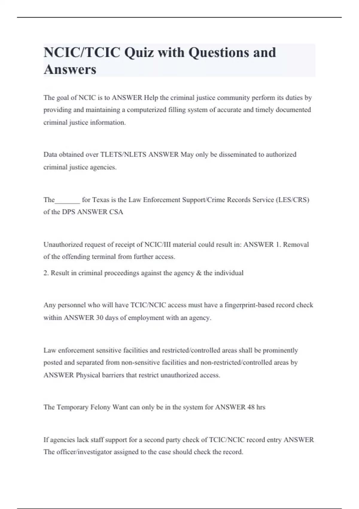 NCIC/TCIC Quiz with Questions and Answers The goal of NCIC is to ANSWER Help the criminal justice community perform its duties by providing and maintaining a computerized filling system of accurate and timely documented criminal justice information. Data obtained over TLETS/NLETS ANSWER May only be disseminated to authorized criminal justice agencies. The_______ for Texas is the Law Enforcement Support/Crime Records Service (LES/CRS) of the DPS ANSWER CSA Unauthorized request of receipt of NCIC/III material could result in: ANSWER 1. Removal of the offending terminal from further access. 2. Result in criminal proceedings against the agency & the individual Any personnel who will have TCIC/NCIC access must have a fingerprint-based record check within ANSWER 30 days of employment with an agency. Law enforcement sensitive facilities and restricted/controlled areas shall be prominently posted and separated from non-sensitive facilities and non-restricted/controlled areas by ANSWER Physical barriers that restrict unauthorized access. The Temporary Felony Want can only be in the system for ANSWER 48 hrs If agencies lack staff support for a second party check of TCIC/NCIC record entry ANSWER The officer/investigator assigned to the case should check the record.