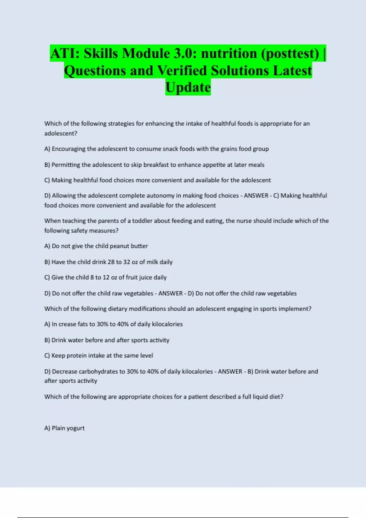 ATI: Skills Module 3.0: nutrition (posttest) | Questions and Verified Solutions Latest Update Which of the following strategies for enhancing the intake of healthful foods is appropriate for an adolescent? A) Encouraging the adolescent to consume snack foods with the grains food group B) Permitting the adolescent to skip breakfast to enhance appetite at later meals C) Making healthful food choices more convenient and available for the adolescent D) Allowing the adolescent complete autonomy in making food choices - ANSWER - C) Making healthful food choices more convenient and available for the adolescent When teaching the parents of a toddler about feeding and eating, the nurse should include which of the following safety measures? A) Do not give the child peanut butter B) Have the child drink 28 to 32 oz of milk daily C) Give the child 8 to 12 oz of fruit juice daily D) Do not offer the child raw vegetables - ANSWER - D) Do not offer the child raw vegetables Which of the following dietary modifications should an adolescent engaging in sports implement? A) In crease fats to 30% to 40% of daily kilo