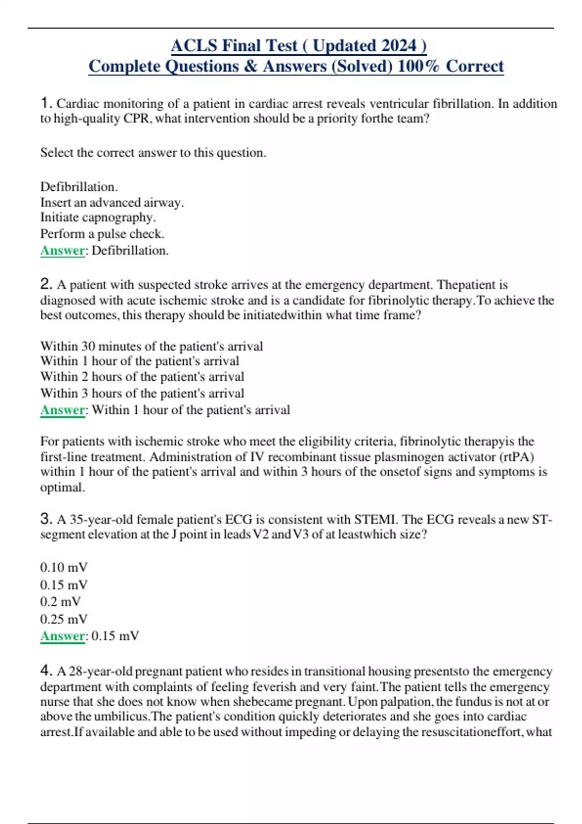 ACLS Final Test ( Updated 2024 ) Complete Questions & Answers (Solved) 100% Correct 1. Cardiac monitoring of a patient in cardiac arrest reveals ventricular fibrillation. In addition to high-quality CPR,what intervention should be a priority forthe team? Select the correct answer to this question. Defibrillation. Insert an advanced airway. Initiate capnography. Perform a pulse check. Answer: Defibrillation. 2. A patient with suspected stroke arrives at the emergency department. Thepatient is diagnosed with acute ischemic stroke and is a candidate for fibrinolytic therapy.To achieve the best outcomes, this therapy should be initiatedwithin what time frame? Within 30 minutes of the patient's arrival Within 1 hour of the patient's arrival Within 2 hours of the patient's arrival Within 3 hours of the patient's arrival Answer: Within 1 hour of the patient's arrival For patients with ischemic stroke who meet the eligibility criteria, fibrinolytic therapyis the first-line treatment. Administration of IV recombinant tissue plasminogen activator (rtPA) within 1 hour of the patient's arrival and within 3 hours of the onsetof signs and symptoms is optimal. 3. A 35-year-old female patient's ECG is consistent with STEMI. The ECG reveals a new STsegment elevation at the J point in leadsV2 andV3 of at leastwhich size? 0.10 mV 0.15 mV 0.2 mV 0.25 mV Answer: 0.15 mV 4. A 28-year-old pregnant patient who residesin transitional housing presentsto the emergency department with complaints of feeling feverish and very faint.The patient tells the emergency nurse that she does not know when shebecame pregnant.Upon palpation,the fundusis not at or above the umbilicus.The patient's condition quickly deteriorates and she goes into cardiac arrest.If available and able to be used without impeding or delaying the resuscitationeffort,what diagnostic tool could be used to guide decision-making in the care of this patient? Abdominal radiograph Fetal monitoring Point-of-care ultrasound Fetal echocardiogram Answer: Point-of-care ultrasound