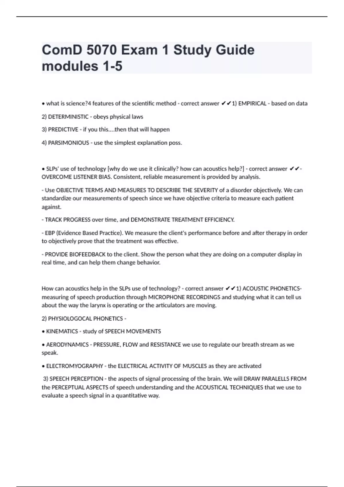 ComD 5070 Exam 1 Study Guide modules 1-5• what is science?4 features of the scientific method - correct answer 1) EMPIRICAL - based on data 2) DETERMINISTIC - obeys physical laws 3) PREDICTIVE - if you this....then that will happen 4) PARSIMONIOUS - use the simplest explanation poss. • SLPs' use of technology [why do we use it clinically? how can acoustics help?] - correct answer - OVERCOME LISTENER BIAS. Consistent, reliable measurement is provided by analysis. - Use OBJECTIVE TERMS AND MEASURES TO DESCRIBE THE SEVERITY of a disorder objectively. We can standardize our measurements of speech since we have objective criteria to measure each patient against. - TRACK PROGRESS over time, and DEMONSTRATE TREATMENT EFFICIENCY. - EBP (Evidence Based Practice). We measure the client's performance before and after therapy in order to objectively prove that the treatment was effective. - PROVIDE BIOFEEDBACK to the client. Show the person what they are doing on a computer display in real time, and can help them change behavior. How can acoustics help in the SLPs use of technology? - correct answer 1) ACOUSTIC PHONETICS- measuring of speech production through MICROPHONE RECORDINGS and studying what it can tell us about the way the larynx is operating or the articulators are moving. 2) PHYSIOLOGOCAL PHONETICS - • KINEMATICS - study of SPEECH MOVEMENTS • AERODYNAMICS - PRESSURE, FLOW and RESISTANCE we use to regulate our breath stream as we speak. • ELECTROMYOGRAPHY - the ELECTRICAL ACTIVITY OF MUSCLES as they are activated 3) SPEECH PERCEPTION - the aspects of signal processing of the brain. We will DRAW PARALELLS FROM the PERCEPTUAL ASPECTS of speech understanding and the ACOUSTICAL TECHNIQUES that we use to evaluate a speech signal in a quantitative way.