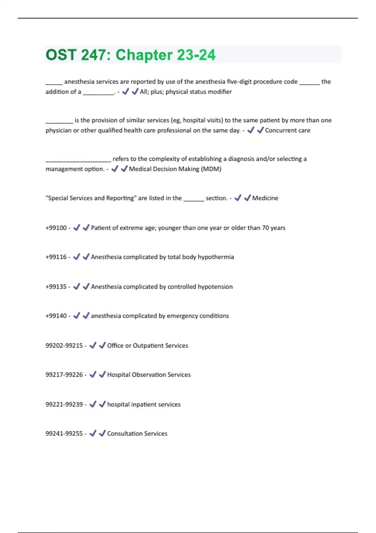 _____ anesthesia services are reported by use of the anesthesia five-digit procedure code ______ the addition of a _________. - All; plus; physical status modifier ________ is the provision of similar services (eg, hospital visits) to the same patient by more than one physician or other qualified health care professional on the same day. - Concurrent care ___________________ refers to the complexity of establishing a diagnosis and/or selecting a management option. - Medical Decision Making (MDM) "Special Services and Reporting" are listed in the ______ section. - Medicine +99100 - Patient of extreme age; younger than one year or older than 70 years +99116 - Anesthesia complicated by total body hypothermia +99135 - Anesthesia complicated by controlled hypotension +99140 - anesthesia complicated by emergency conditions - Office or Outpatient Services - Hospital Observation Services - hospital inpatient services - Consultation Services - Emergency Department Services 99304-99318 - Nursing Facility Services - Domiciliary, Rest Home (Boarding home) or Custodial Care Services - Domiciliary, Rest Home (assisted living facility), or home care plan oversight services - Home Services - prolonged services - Case Management Evaluation and Management Services
