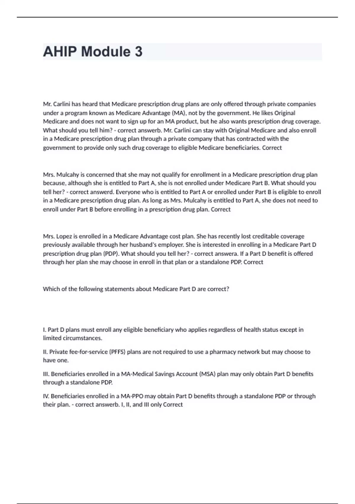 Mr. Carlini has heard that Medicare prescription drug plans are only offered through private companies under a program known as Medicare Advantage (MA), not by the government. He likes Original Medicare and does not want to sign up for an MA product, but he also wants prescription drug coverage. What should you tell him? - correct answerb. Mr. Carlini can stay with Original Medicare and also enroll in a Medicare prescription drug plan through a private company that has contracted with the government to provide only such drug coverage to eligible Medicare beneficiaries. Correct Mrs. Mulcahy is concerned that she may not qualify for enrollment in a Medicare prescription drug plan because, although she is entitled to Part A, she is not enrolled under Medicare Part B. What should you tell her? - correct answerd. Everyone who is entitled to Part A or enrolled under Part B is eligible to enroll in a Medicare prescription drug plan. As long as Mrs. Mulcahy is entitled to Part A, she does not need to enroll under Part B before enrolling in a prescription drug plan. Correct Mrs. Lopez is enrolled in a Medicare Advantage cost plan. She has recently lost creditable coverage previously available through her husband's employer. She is interested in enrolling in a Medicare Part D prescription drug plan (PDP). What should you tell her? - correct answera. If a Part D benefit is offered through her plan she may choose in enroll in that plan or a standalone PDP. Correct Which of the following statements about Medicare Part D are correct? I. Part D plans must enroll any eligible beneficiary who applies regardless of health status except in limited circumstances. II. Private fee-for-service (PFFS) plans are not required to use a pharmacy network but may choose to have one. III. Beneficiaries enrolled in a MA-Medical Savings Account (MSA) plan may only obtain Part D benefits through a standalone PDP. IV. Beneficiaries enrolled in a MA-PPO may obtain Part D benefits through a standalone PDP or through their plan. - correct answerb. I, II, and III only Correct