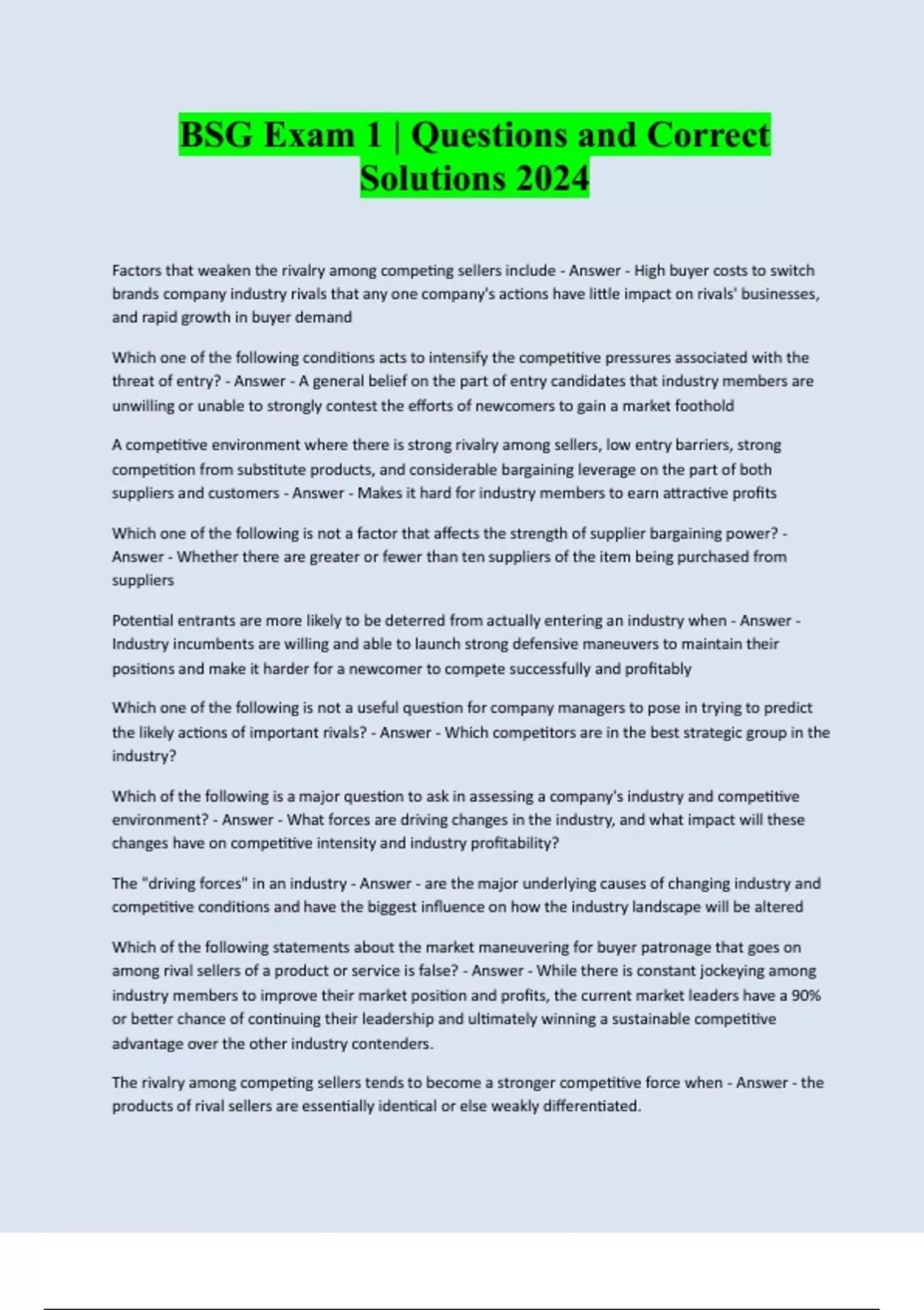 BSG Exam 1 | Questions and Correct Solutions 2024 Factors that weaken the rivalry among competing sellers include - Answer - High buyer costs to switch brands company industry rivals that any one company's actions have little impact on rivals' businesses, and rapid growth in buyer demand Which one of the following conditions acts to intensify the competitive pressures associated with the threat of entry? - Answer - A general belief on the part of entry candidates that industry members are unwilling or unable to strongly contest the efforts of newcomers to gain a market foothold A competitive environment where there is strong rivalry among sellers, low entry barriers, strong competition from substitute products, and considerable bargaining leverage on the part of both suppliers and customers - Answer - Makes it hard for industry members to earn attractive profits Which one of the following is not a factor that affects the strength of supplier bargaining power? - Answer - Whether there are greater or fewer than ten suppliers of the item being purchased from suppliers Potential entrants are more likely to be deterred from actually entering an industry when - Answer - Industry incumbents are willing and able to launch strong defensive maneuvers to maintain their positions and make it harder for a newcomer to compete successfully and profitably Which one of the following is not a useful question for company managers to pose in trying to predict the likely actions of important rivals? - Answer - Which competitors are in the best strategic group in the industry? Which of the following is a major question to ask in assessing a company's industry and competitive environment? - Answer - What forces are driving changes in the industry, and what impact will these changes have on competitive intensity and industry profitability? The "driving forces" in an industry - Answer - are the major underlying causes of changing industry and competitive conditions and have the biggest influence on how the industry landscape will be altered Which of the following statements about the market maneuvering