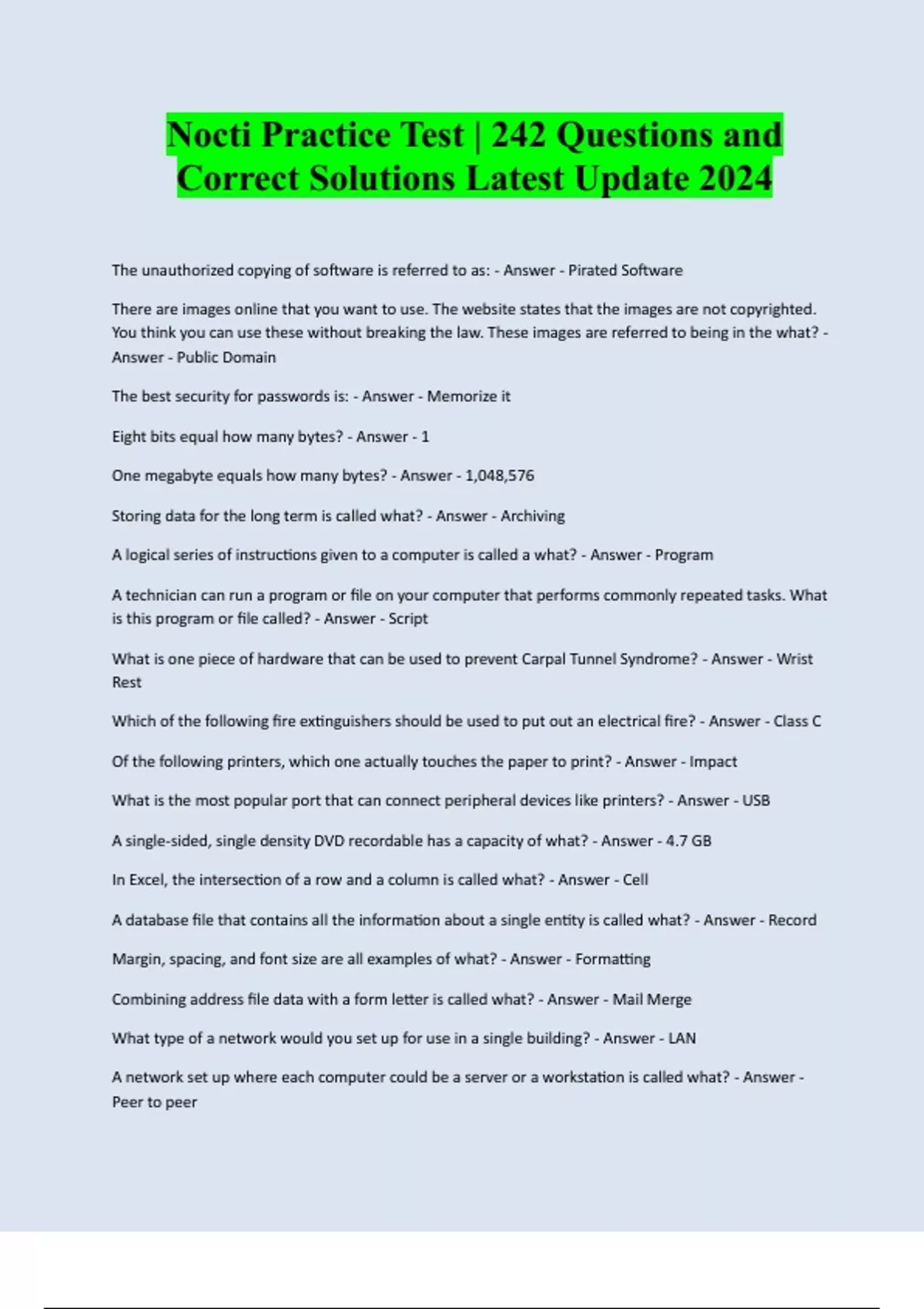 Nocti Practice Test | 242 Questions and Correct Solutions Latest Update 2024 The unauthorized copying of software is referred to as: - Answer - Pirated Software There are images online that you want to use. The website states that the images are not copyrighted. You think you can use these without breaking the law. These images are referred to being in the what? - Answer - Public Domain The best security for passwords is: - Answer - Memorize it Eight bits equal how many bytes? - Answer - 1 One megabyte equals how many bytes? - Answer - 1,048,576 Storing data for the long term is called what? - Answer - Archiving A logical series of instructions given to a computer is called a what? - Answer - Program A technician can run a program or file on your computer that performs commonly repeated tasks. What is this program or file called? - Answer - Script What is one piece of hardware that can be used to prevent Carpal Tunnel Syndrome? - Answer - Wrist Rest Which of the following fire extinguishers should be used to put out an electrical fire? - Answer - Class C Of the following printers, which one actually touches the paper to print? - Answer - Impact What is the most popular port that can connect peripheral devices like printers? - Answer - USB A single-sided, single density DVD recordable has a capacity of what? - Answer - 4.7 GB In Excel, the intersection of a row and a column is called what? - Answer - Cell A database file that contains all the information about a single entity is called what? - Answer - Record Margin, spacing, and font size are all examples of what? - Answer - Formatting Combining address file data with a form letter is called what? - Answer - Mail Merge What type of a network would you set up for use in a single building? - Answer - LAN A network set up where each computer could be a server or a workstation is called what? - Answer - Peer to peer