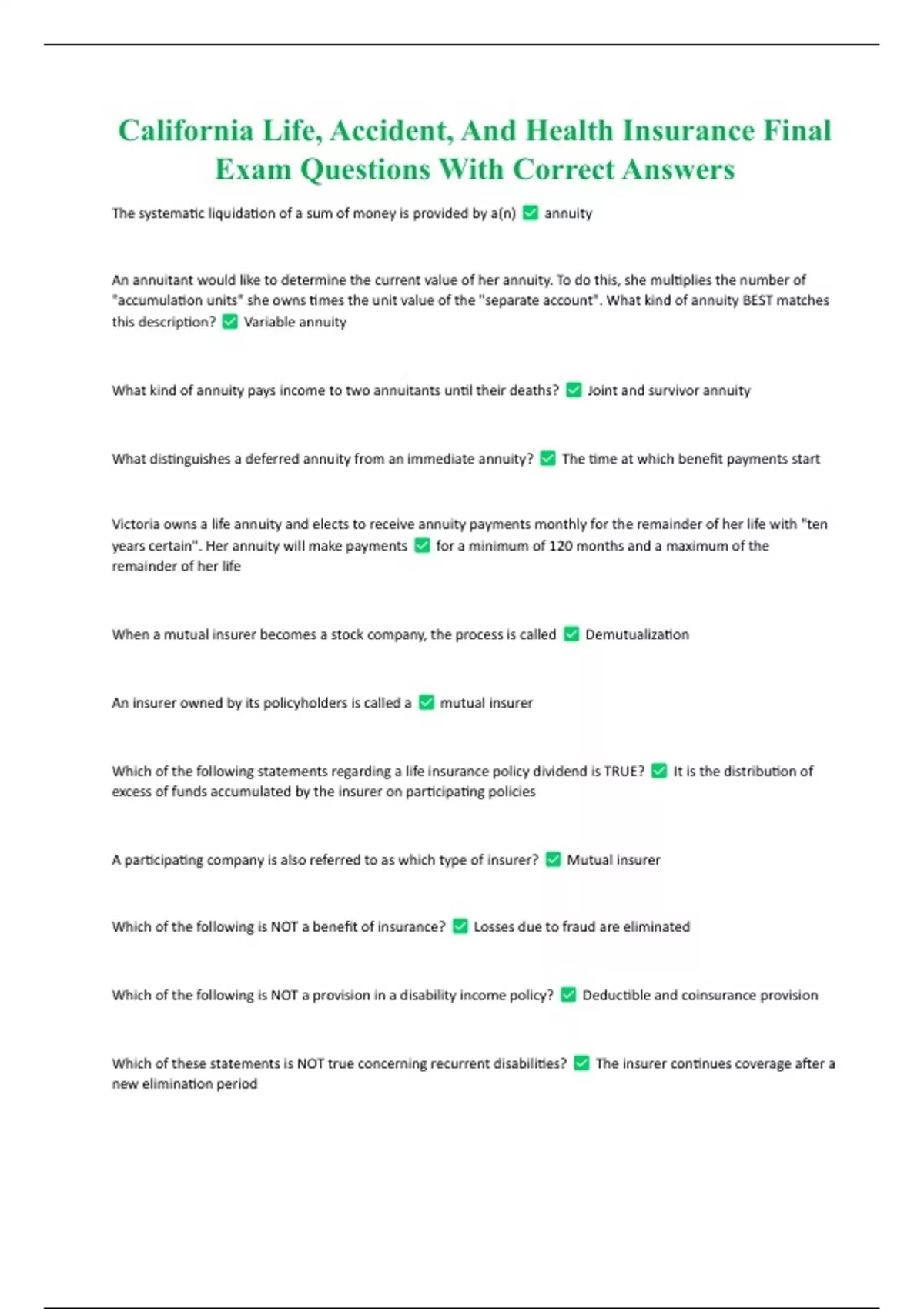 California Life, Accident, And Health Insurance Final Exam Questions With Correct Answers The systematic liquidation of a sum of money is provided by a(n) annuity An annuitant would like to determine the current value of her annuity. To do this, she multiplies the number of "accumulation units" she owns times the unit value of the "separate account". What kind of annuity BEST matches this description? Variable annuity What kind of annuity pays income to two annuitants until their deaths? Joint and survivor annuity What distinguishes a deferred annuity from an immediate annuity? The time at which benefit payments start
