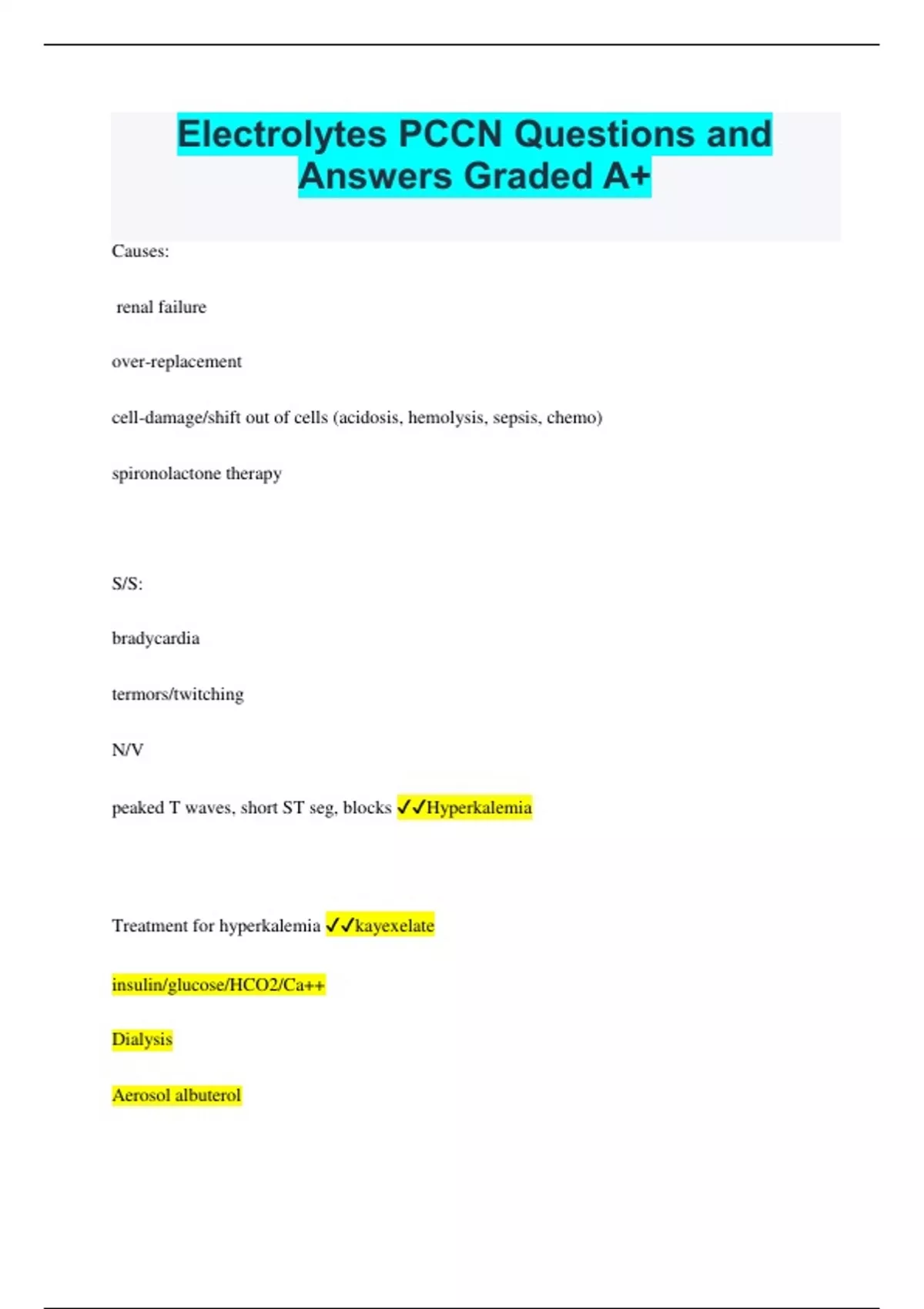 Causes: renal failure over-replacement cell-damage/shift out of cells (acidosis, hemolysis, sepsis, chemo) spironolactone therapy S/S: bradycardia termors/twitching N/V peaked T waves, short ST seg, blocks Hyperkalemia Treatment for hyperkalemia kayexelate insulin/glucose/HCO2/Ca++ Dialysis Aerosol albuterolCauses: Poor PO intake Renal loss (diuretics, renal tubular