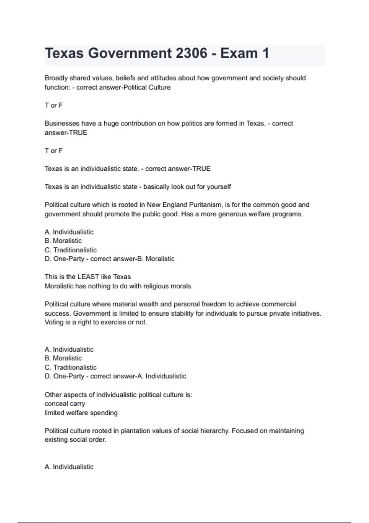 Texas is an individualistic state. - correct answer-TRUE