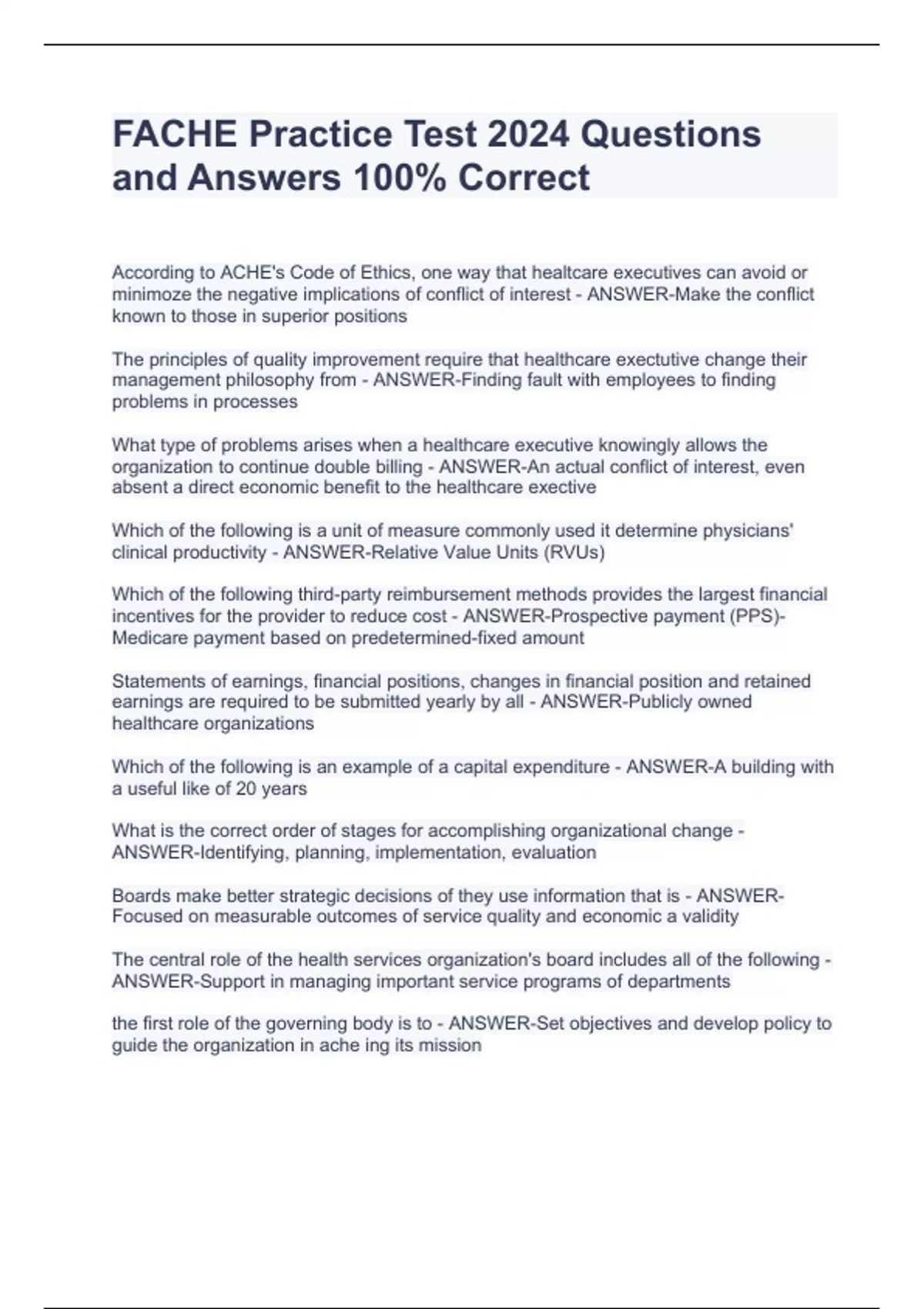 FACHE Practice Test 2024 Questions and Answers 100% CorrectFACHE Practice Test 2024 Questions and Answers 100% CorrectFACHE Practice Test 2024 Questions and Answers 100% CorrectFACHE Practice Test 2024 Questions and Answers 100% Correct According to ACHE's Code of Ethics, one way that healtcare executives can avoid or minimoze the negative implications of conflict of interest - ANSWER-Make the conflict known to those in superior positions The principles of quality improvement require that healthcare exectutive change their management philosophy from - ANSWER-Finding fault with employees to finding