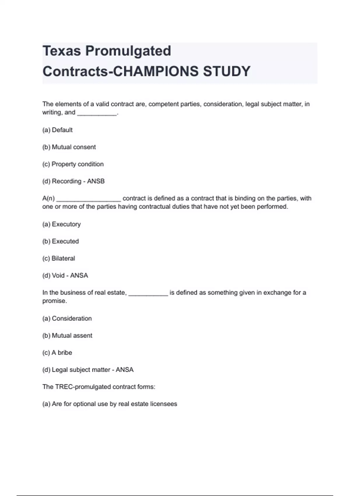Texas Promulgated Contracts-CHAMPIONS STUDY questions and answers graded A+ by experts 2024/2025