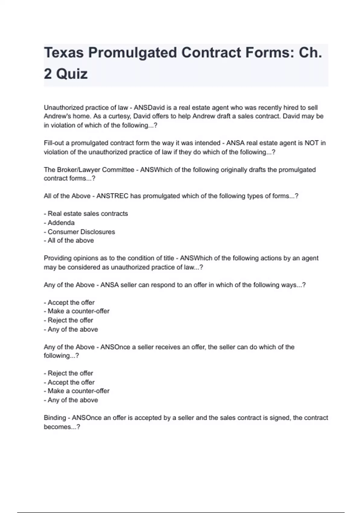 Texas Promulgated Contract Forms: Ch. 2 Quiz questions and answers graded A+ by experts 2024/2025