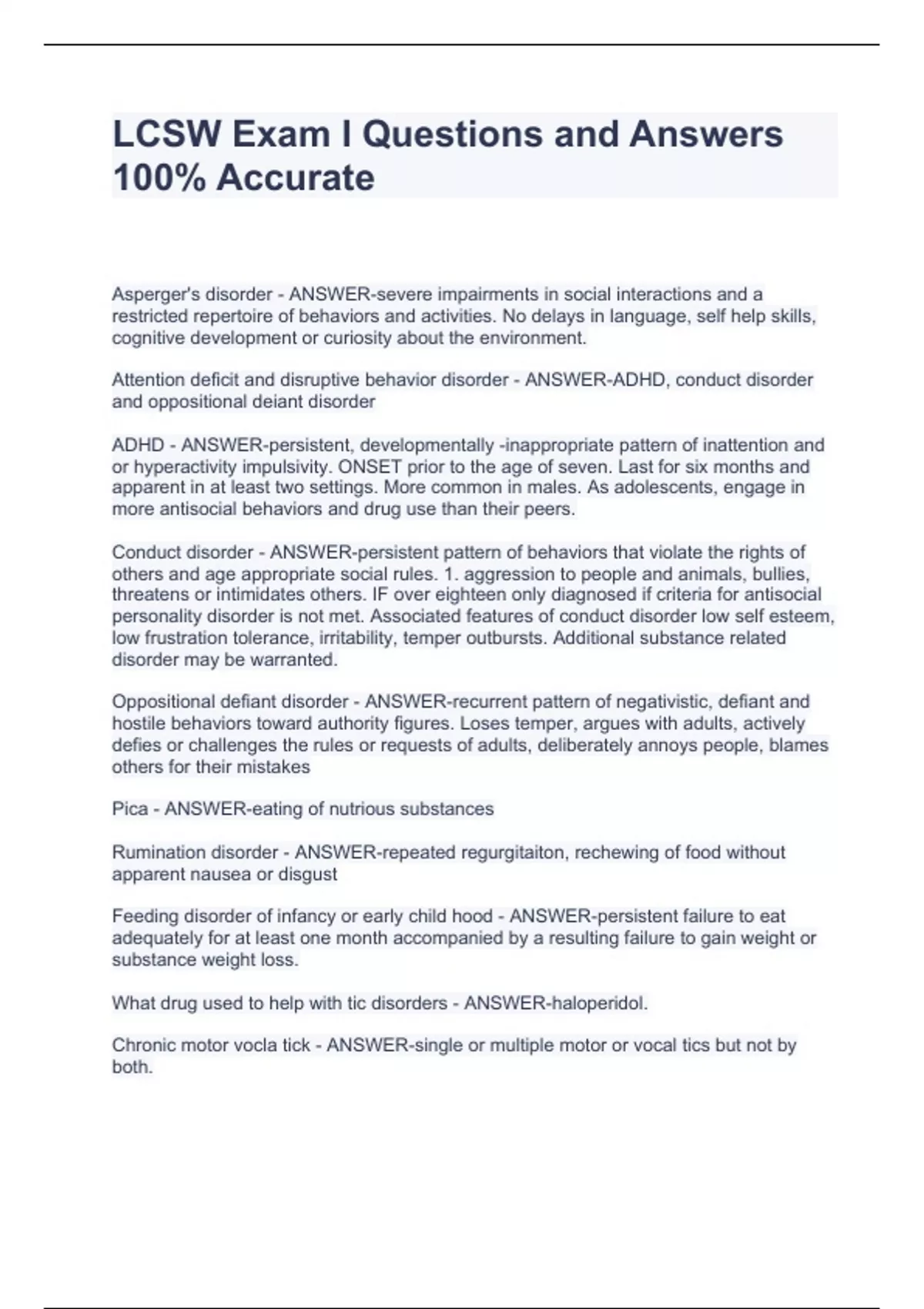 LCSW Exam I Questions and Answers 100% Accurate LCSW Exam I Questions and Answers 100% Accurate LCSW Exam I Questions and Answers 100% Accurate LCSW Exam I Questions and Answers 100% Accurate LCSW Exam I Questions and Answers 100% Accurate Asperger's disorder - ANSWER-severe impairments in social interactions and a restricted repertoire of behaviors and activities. No delays in language, self help skills, cognitive development or curiosity about the environment. Attention deficit and disruptive behavior disorder - ANSWER-ADHD, conduct disorder and oppositional deiant disorder ADHD - ANSWER-persistent, developmentally -inappropriate pattern of inattention and or hyperactivity impulsivity. ONSET prior to the age of seven. Last for six months and
