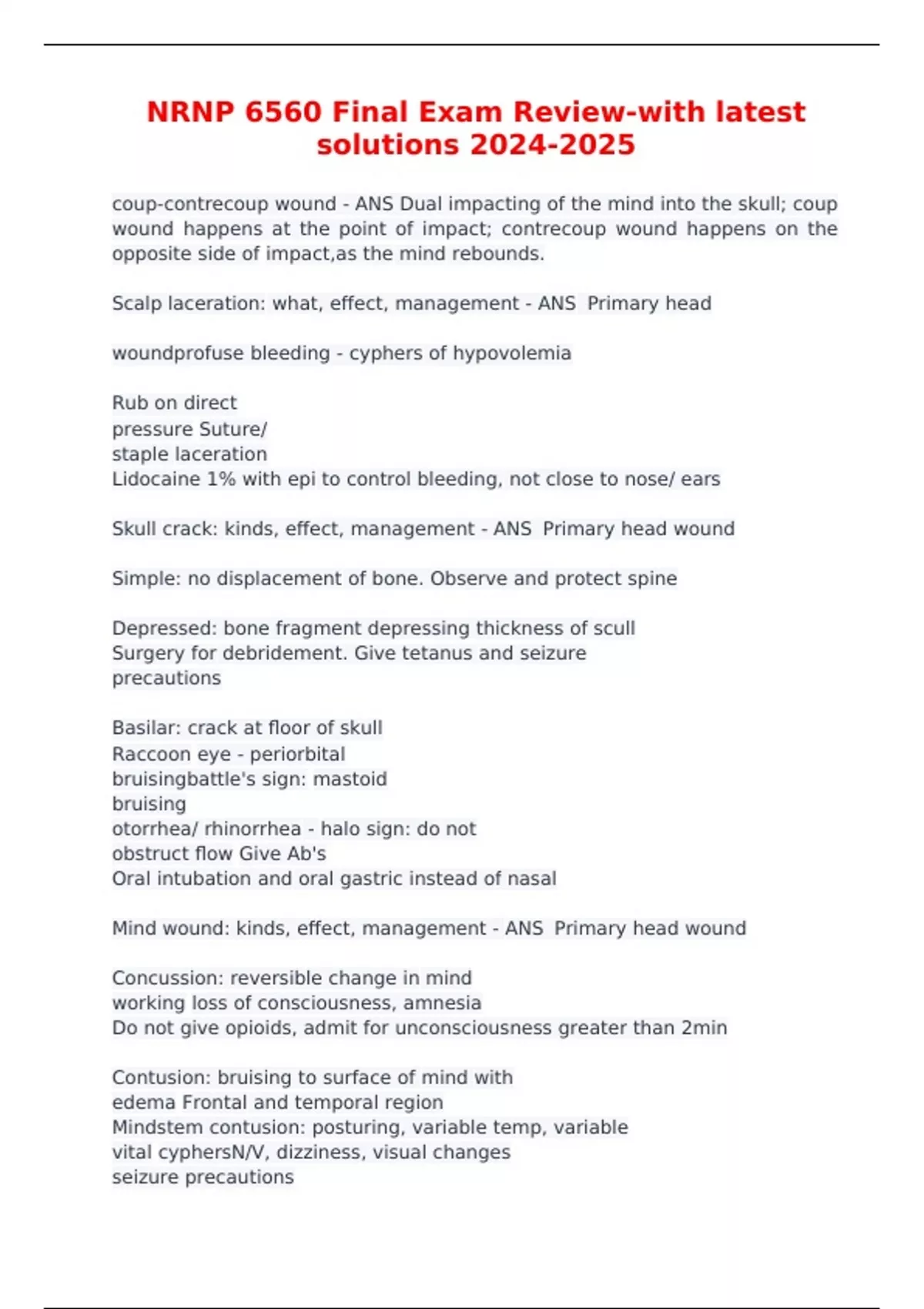 NRNP 6560 Final Exam Review-with latest solutions coup-contrecoup wound - ANS Dual impacting of the mind into the skull; coup wound happens at the point of impact; contrecoup wound happens on the opposite side of impact,as the mind rebounds.