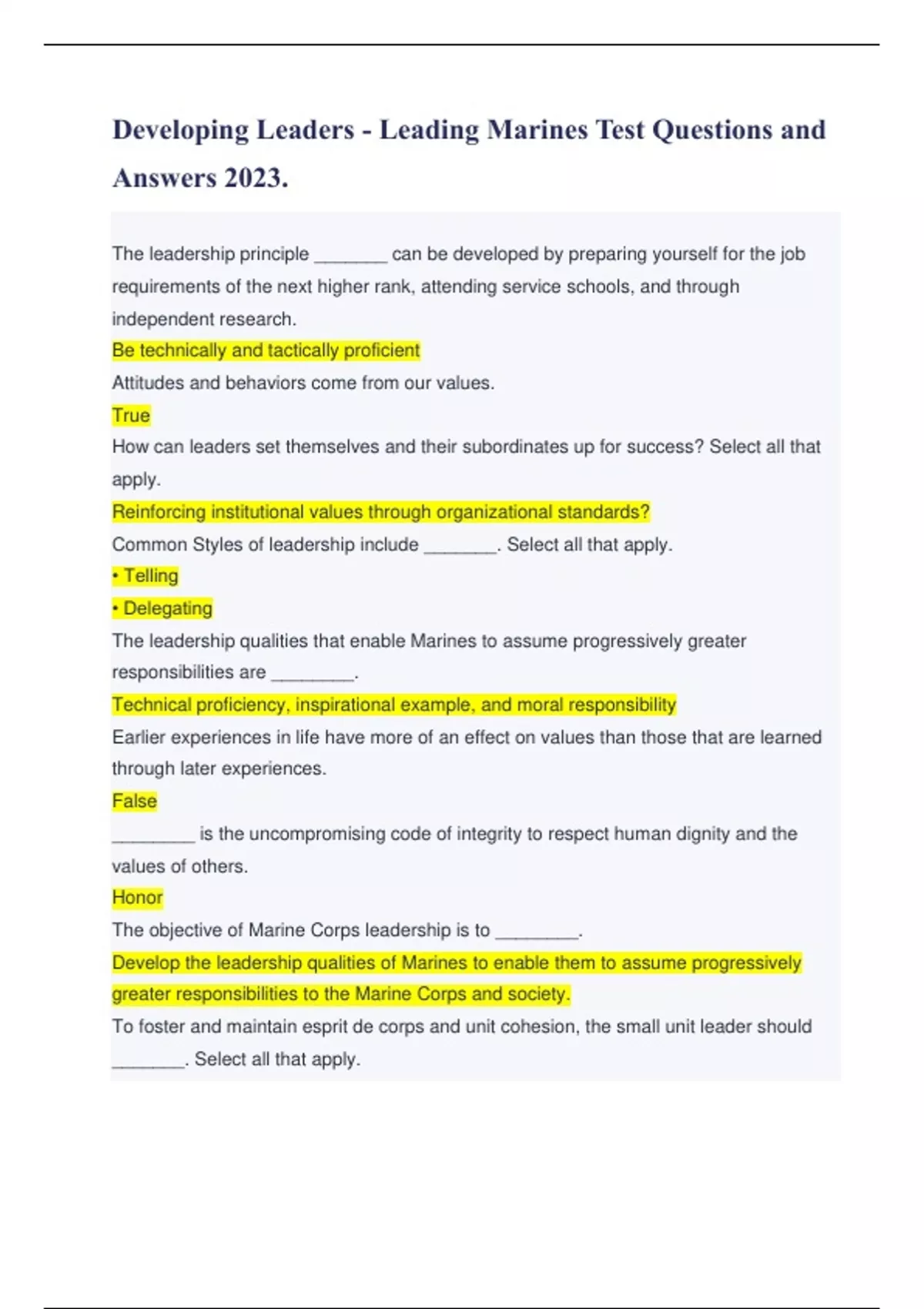 Developing Leaders - Leading Marines Test Questions and Answers 2023. The leadership principle _______ can be developed by preparing yourself for the job requirements of the next higher rank, attending service schools, and through independent research. Be technically and tactically proficient Attitudes and behaviors come from our values. True How can leaders set themselves and their subordinates up for success? Select all that apply. Reinforcing institutional values through organizational standards? Common Styles of leadership include _______. Select all that apply. • Telling • Delegating The leadership qualities that enable Marines to assume progressively greater responsibilities are ________. Technical proficiency, inspirational example, and moral responsibility Earlier experiences in life have more of an effect on values than those that are learned through later experiences. False ________ is the uncompromising code of integrity to respect human dignity and the values of others. Honor The objective of Marine Corps leadership is to ________. Develop the leadership qualities of Marines to enable them to assume progressively greater responsibilities to the Marine Corps and society.