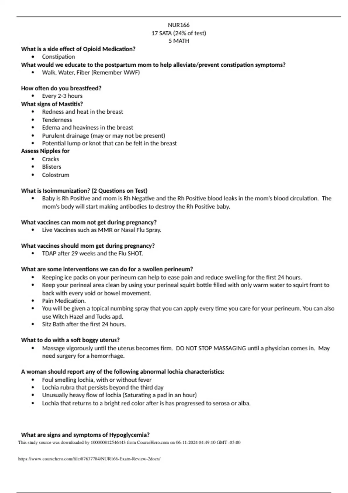 NUR166 17 SATA (24% of test) 5 MATH What is a side effect of Opioid Medication? Constipation What would we educate to the postpartum mom to help alleviate/prevent constipation symptoms? Walk, Water, Fiber (Remember WWF) How often do you breastfeed? Every 2-3 hours What signs of Mastitis? Redness and heat in the breast Tenderness Edema and heaviness in the breast Purulent drainage (may or may not be present) Potential lump or knot that can be felt in the breast Assess Nipples for Cracks Blisters Colostrum What is Isoimmunization? (2 Questions on Test) Baby is Rh Positive and mom is Rh Negative and the Rh Positive blood leaks in the mom’s blood circulation. The mom’s body will start making antibodies to destroy the Rh Positive baby. What vaccines can mom not get during pregnancy? Live Vaccines such as MMR o