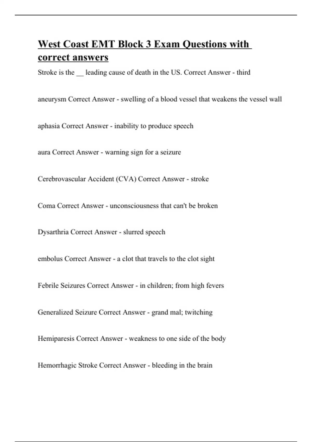 Stroke is the __ leading cause of death in the US. Correct Answer - third aneurysm Correct Answer - swelling of a blood vessel that weakens the vessel wall aphasia Correct Answer - inability to produce speech aura Correct Answer - warning sign for a seizure Cerebrovascular Accident (CVA) Correct Answer - stroke Coma Correct Answer - unconsciousness that can't be broken Dysarthria Correct Answer - slurred speech embolus Correct Answer - a clot that travels to the clot sight Febrile Seizures Correct Answer - in children; from high fevers Generalized Seizure Correct Answer - grand mal; twitching Hemiparesis Correct Answer - weakness to one side of the body Hemorrhagic Stroke Correct Answer - bleeding in the brain