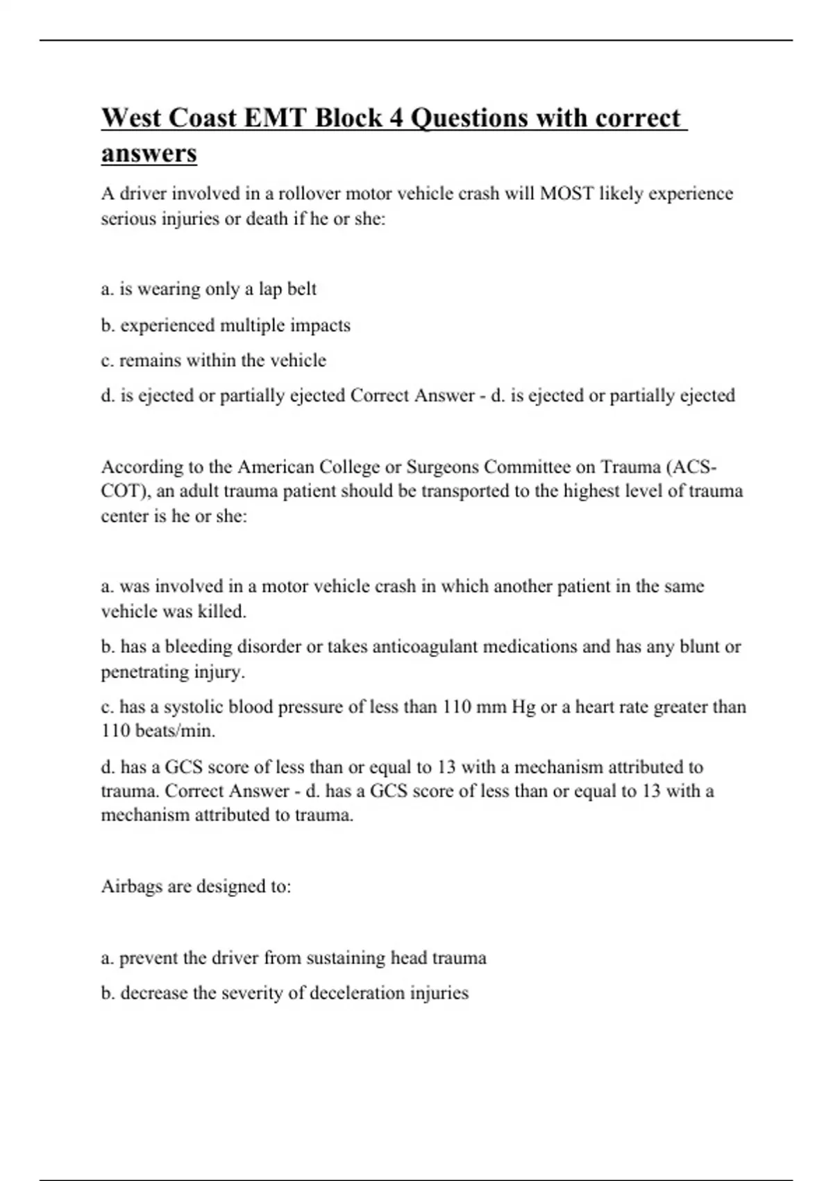 A driver involved in a rollover motor vehicle crash will MOST likely experience serious injuries or death if he or she: a. is wearing only a lap belt b. experienced multiple impacts c. remains within the vehicle d. is ejected or partially ejected Correct Answer - d. is ejected or partially ejected According to the American College or Surgeons Committee on Trauma (ACS-COT), an adult trauma patient should be transported to the highest level of trauma center is he or she: a. was involved in a motor vehicle crash in which another patient in the same vehicle was killed. b. has a bleeding disorder or takes anticoagulant medications and has any blunt or penetrating injury. c. has a systolic blood pressure of less than 110 mm Hg or a heart rate greater than 110 beats/min. d. has a GCS score of less than or equal to 13 with a mechanism attributed to trauma. Correct Answer - d. has a GCS score of less than or equal to 13 with a mechanism attributed to trauma. Airbags are designed to: a. prevent the driver from sustaining head trauma b. decrease the severity of deceleration injuries