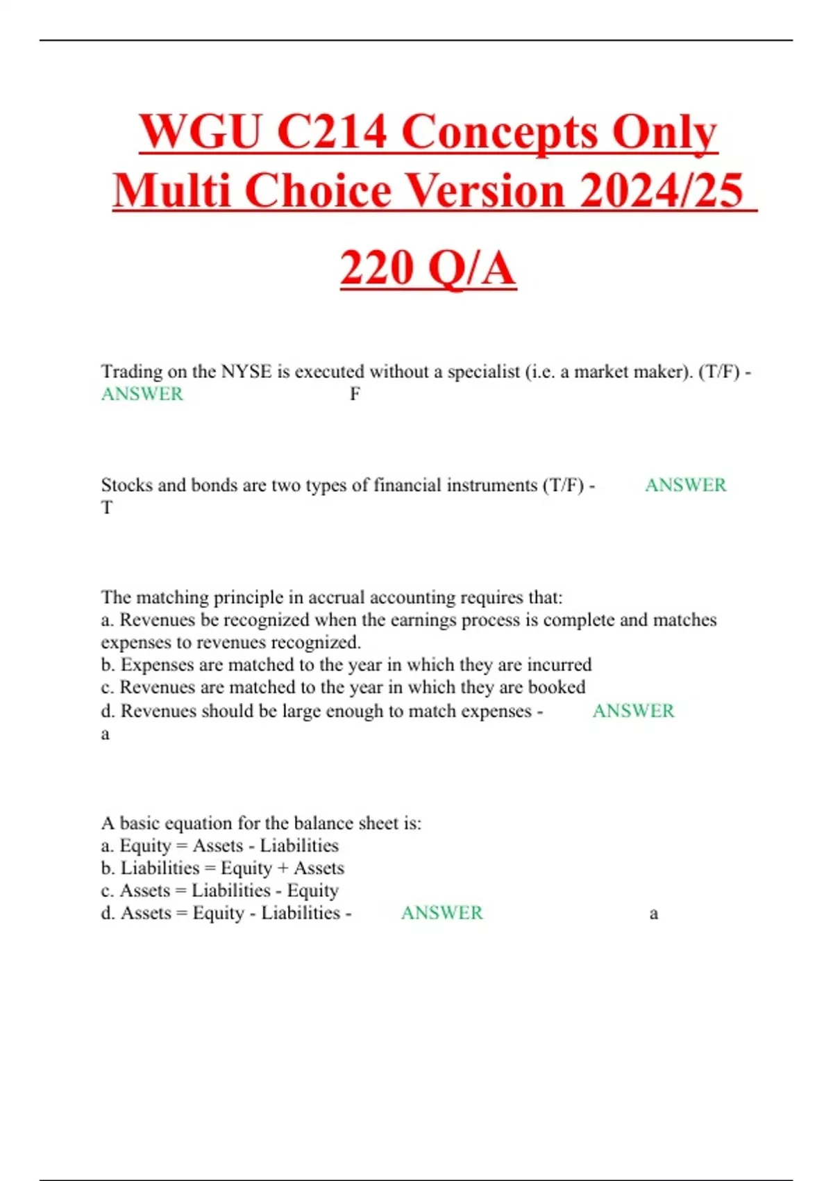WGU C214 Concepts Only Multi Choice Version 2024/25 220 Q/A Trading on the NYSE is executed without a specialist (i.e. a market maker). (T/F) - ANSWER F Stocks and bonds are two types of financial instruments (T/F) - ANSWER T The matching principle in accrual accounting requires that: a. Revenues be recognized when the earnings process is complete and matches expenses to revenues recognized. b. Expenses are matched to the year in which they are incurred c. Revenues are matched to the year in which they are booked d. Revenues should be large enough to match expenses - ANSWER