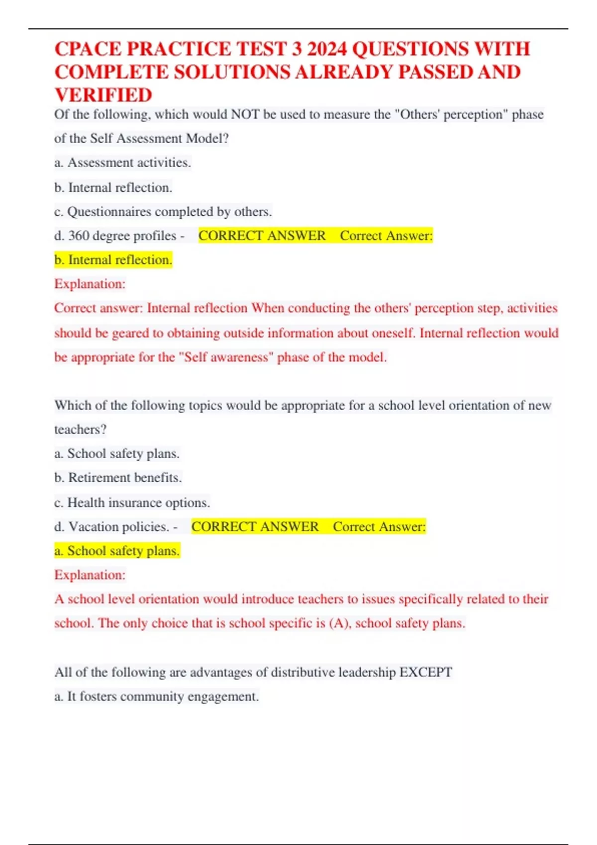 Of the following, which would NOT be used to measure the "Others' perception" phase of the Self Assessment Model? a. Assessment activities. b. Internal reflection. c. Questionnaires completed by others. d. 360 degree profiles - CORRECT ANSWER Correct Answer: b. Internal reflection. Explanation: Correct answer: Internal reflection When conducting the others' perception step, activities should be geared to obtaining outside information about oneself. Internal reflection would be appropriate for the "Self awareness" phase of the model. Which of the following topics would be appropriate for a school level orientation of new teachers? a. School safety plans. b. Retirement benefits. c. Health insurance options. d. Vacation policies. - CORRECT ANSWER Correct Answer: a. School safety plans. Explanation: A school level orientation would introduce teachers to issues specifically related to their school. The only choice that is school specific is (A), school safety plans. All of the following are advantages of distributive leadership EXCEPT a. It fosters community engagement. CPACE PRACTICE TEST 3 2024 QUESTIONS WITH COMPLETE SOLUTIONS ALREADY PASSED AND VERIFIED b. It creates broader commitment to the success of schools. c. It provides opportunities for professional growth. d. It reduces the workload of administrators. - CORRECT ANSWER Correct answer: d. It reduces the workload of administrators. Explanation: Distributive leadership spreads decision making throughout the school, creating a "flatter" governance structure. It fosters community engagement and a broader commitment to the success of schools. It also provides opportunities for professional growth by enabling teachers to assume leadership roles. Distributive leadership does not necessarily reduce the workload of administrators because they still have the same responsibilities. When communicating about a sensitive problem, it is important for a superintendent to Choose a method of communication that will minimize misunderstanding. Keep the message undefined to avoid repercussions. Present the message in such a way that different groups will interpret it differently. Delegate the responsibility to an administrator who is a skilled communicator. - CORRECT ANSWER Correct Answer: Choose a method of communication that will minimize misunderstanding. Explanation: When dealing with a sensitive problem, it is important to choose a method of communication that will minimize misunderstanding. For example, it may be inappropriate to use email in such a situation because people frequently misinterpret the tone and intent of email messages. So the correct answer is (A). Keeping the message vague (B), (C) would just lead to misunderstanding. Putting off the communication (D) or delegating the task (E) would be shirking responsibility. CPACE PRACTICE TEST 3 2024 QUESTIONS WITH COMPLETE SOLUTIONS ALREADY PASSED AND VERIFIED In a school with a diverse student population, a teacher should Stress the advantages of becoming more attuned to mainstream culture. Use the cultural background of each child to teach new skills. Discourage any signs of cultural differences, such as head scarves or yarmulkes. Deemphasize cultural differences to promote greater harmony. - CORRECT ANSWER The Correct answer is: use the cultural background of each child to teach new skills Explanation: Choice B is the right answer because in a culturally diverse school, teachers should recognize and respect cultural differences and use the cultural background of each child to teach new skills. Marvin Rowland is the assistant superintendent of Pike Public Schools. As the assistant superintendent, he meets with teachers who are newly hired in the school district. During the meeting he goes through the instructional model, reviews the curriculum and orients the new teachers to the assessment protocol. Also, he provides the teachers with techniques to manage their class and increase student achievement. What type of leadership does Marvin Rowland's exhibit? Divisional Intercollegiate Progression Supervision - CORRECT ANSWER The correct answer: is supervision. Explanation: Superintendents and principals can help foster higher quality teachers, especially when new teachers are hired, by encouraging them and guiding them. This form of leadership is a style known as collegial supervision. With collegial supervision, the leaders partner