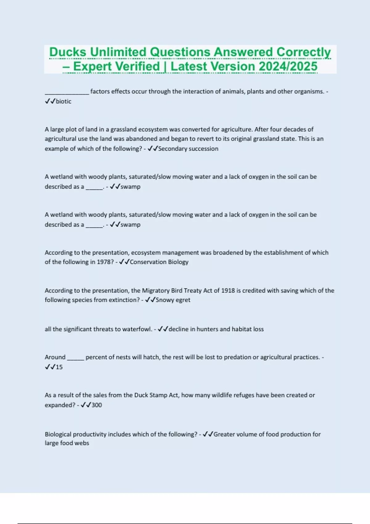 _____________ factors effects occur through the interaction of animals, plants and other organisms. - biotic A large plot of land in a grassland ecosystem was converted for agriculture. After four decades of agricultural use the land was abandoned and began to revert to its original grassland state. This is an example of which of the following? - Secondary succession A wetland with woody plants, saturated/slow moving water and a lack of oxygen in the soil can be described as a _____. - swamp A wetland with woody plants, saturated/slow moving water and a lack of oxygen in the soil can be described as a _____. - swamp According to the presentation, ecosystem management was broadened by the establishment of which of the following in 1978? - Conservation Biology According to the presentation, the Migratory Bird Treaty Act of 1918 is credited with saving which of the following species from extinction? - Snowy egret all the significant threats to waterfowl. - decline in hunters and habitat loss Around _____ percent of nests will hatch, the rest will be lost to predation or agricultural practices. - 15