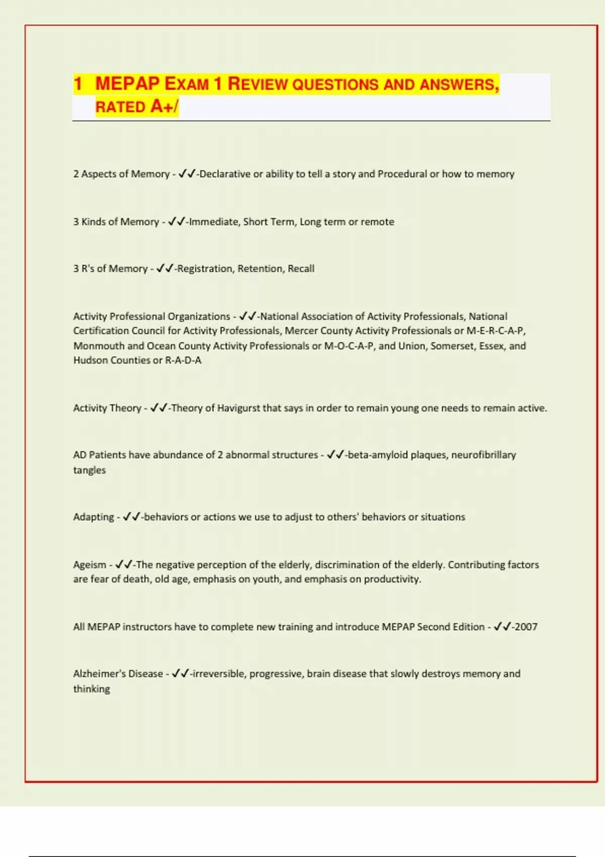 MEPAP EXAM 1 REVIEW QUESTIONS AND ANSWERS, RATED A+/ 2 Aspects of Memory - -Declarative or ability to tell a story and Procedural or how to memory 3 Kinds of Memory - -Immediate, Short Term, Long term or remote 3 R's of Memory - -Registration, Retention, Recall Activity Professional Organizations - -National Association of Activity Professionals, National Certification Council for Activity Professionals, Mercer County Activity Professionals or M-E-R-C-A-P, Monmouth and Ocean County Activity Professionals or M-O-C-A-P, and Union, Somerset, Essex, and Hudson Counties or R-A-D-A Activity Theory - -Theory of Havigurst that says in order to remain young one needs to remain active. AD Patients have abundance of 2 abnormal structures - -beta-amyloid plaques, neurofibrillary tangles Adapting - -behaviors or actions we use to adjust to others' behaviors or situations Ageism - -The negative perception of the elderly, discrimination of the elderly. Contributing factors are fear of death, old age, emphasis on youth,