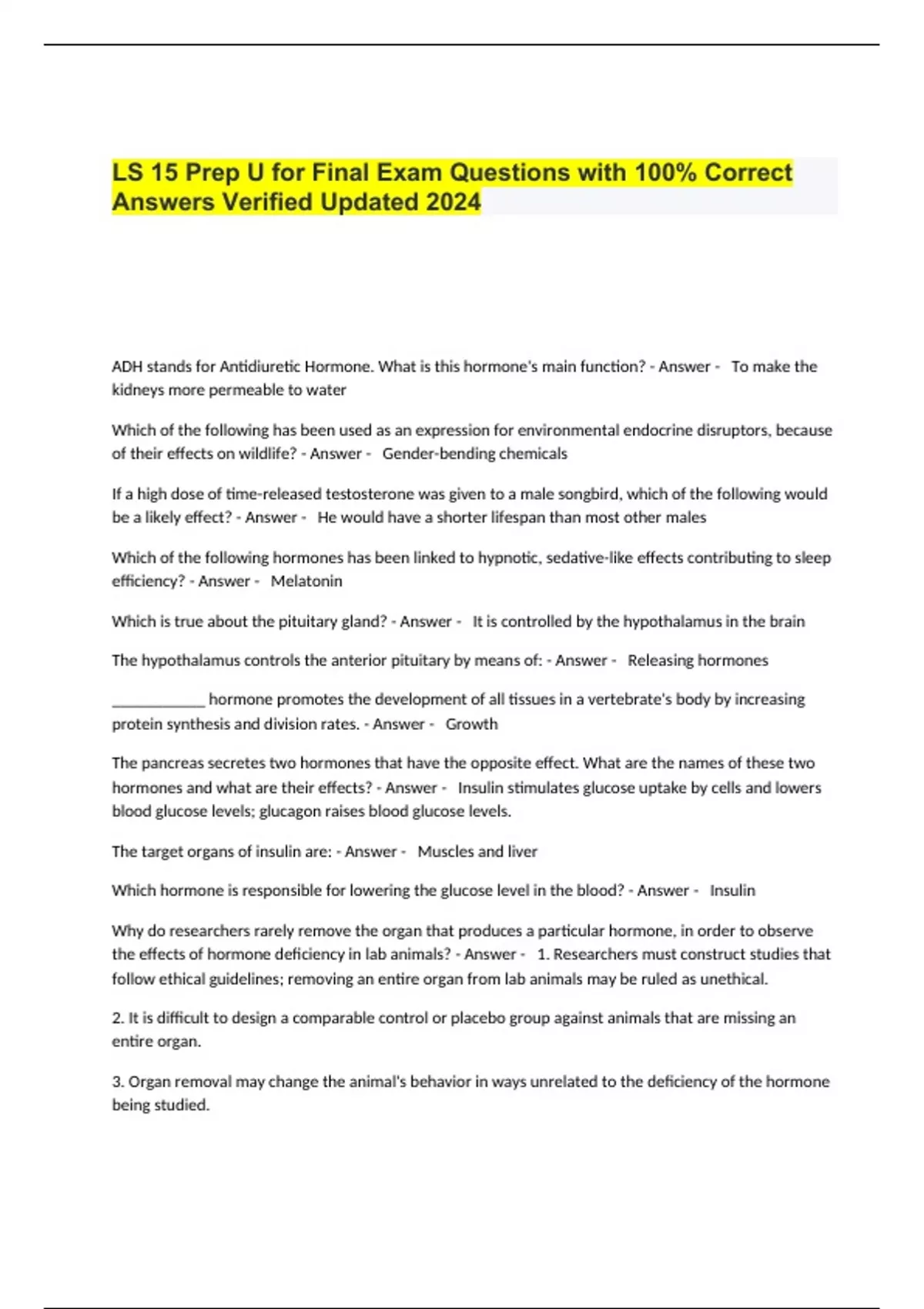 LS 15 Prep U for Final Exam Questions with 100% Correct Answers Verified Updated 2024.