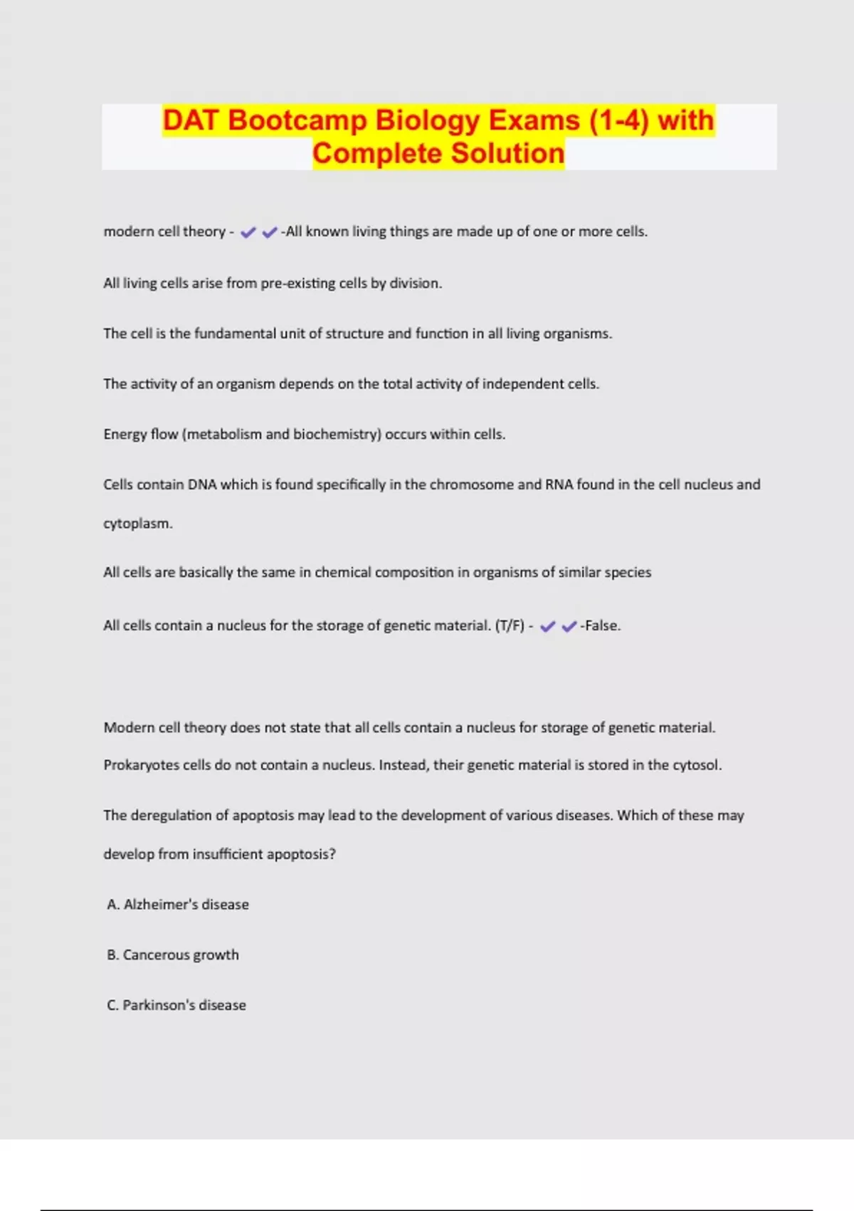 DAT Bootcamp Biology Exams (1-4) with Complete Solution modern cell theory - -All known living things are made up of one or more cells. All living cells arise from pre-existing cells by division. The cell is the fundamental unit of structure and function in all living organisms. The activity of an organism depends on the total activity of independent cells. Energy flow (metabolism and biochemistry) occurs within cells. Cells contain DNA which is found specifically in the chromosome and RNA found in the cell nucleus and cytoplasm. All cells are basically the same in chemical composition in organisms of similar species All cells contain a nucleus for the storage of genetic material. (T/F) - -False. Modern cell theory does not state that all cells contain a nucleus for storage of genetic material. Prokaryotes cells do not contain a nucleus. Instead, their genetic material is stored in the cytosol. The deregulation of apoptosis may lead to the development of various diseases. Which of these may develop from insufficient apoptosis? A. Alzheimer's disease B. Cancerous growth C. Parkinson's disease D. Turner Syndrome E. Huntington's disease - -B. Cancerous growth Cancer is the result of uncontrolled cell proliferation. Apoptosis is programmed cell death, which functions both in normal cell development but is also a necessary part of destroying damaged and mutated cells that multiply uncontrollably. If apoptosis were to be deregulated, uncontrolled cell growths, including cancer, would be an expected result. Turner syndrome is an aneuploidy (specifically a monosomy) that is the result of a missing X chromosome due to nondisjunction in gamete formation during meiosis. - -Alzheimer's, Parkinson's, and Huntington's disease are neurodegenerative diseases, which are characterized by excessive apoptosis. A scientist wants to detach a peripheral membrane protein from the exterior of a cell membrane. Which is the best method to do so? A. Change the salt concentrations. B. Perform a light centrifuge. C. Add a detergent. D. Change the temperature of the solution. E. Run a small current through the solution. - -A. Change the salt concentrations. Peripheral membrane proteins are held in place by hydrogen bonding and electrostatic interactions. To detach such a protein from a cell membrane's exterior, one would need to disrupt these forces. There are two methods that will accomplish this task: changing the salt concentration, or changing the pH (altering the H+ concentration). A light centrifuge will precipitate cells and nuclei at most, only heavy centrifuges extract small soluble proteins. - -Adding a detergent is a method used to extract integral proteins because they are more hydrophobic in nature. The hydrophobic detergent will destroy the membrane and expose the hydrophobic integral protein. Changing the temperature will denature the protein. Running a current through the cell isn't a common or viable method. Miller-Urey Experiment - -The Miller-Urey experiment used ammonia, methane, water and hydrogen sealed in a sterile arrangement of tubes and flasks with connecting loops. After 2 weeks, they observed several organic compounds, a