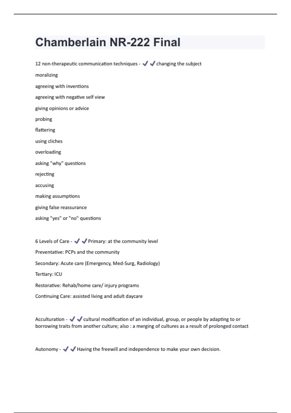 12 non-therapeutic communication techniques - changing the subject moralizing agreeing with inventions agreeing with negative self view giving opinions or advice probing flattering using cliches overloading asking "why" questions rejecting accusing making assumptions giving false reassurance asking "yes" or "no" questions 6 Levels of Care - Primary: at the community level Preventative: PCPs and the community Secondary: Acute care (Emergency, Med-Surg, Radiology) Tertiary: ICU Restorative: Rehab/home care/ injury programs Continuing Care: assisted living and adult daycare Acculturation - cultural modification of an individual, group, or people by adapting to or borrowing traits from another culture; also : a merging of cultures as a result of prolonged contact Autonomy - Having the freewill and independence to make your own decision.Beneficence - Committing the act of charity. To help and give to others. Compare and contrast a therapeutic relationship - it is purposeful, rapport, goal directed, trust, empathy, ethical Compare and contrast cultural competency and cultural appropriate care - The process of acquiring specific knowledge, skills and attitude to ensure delivery of culturally congruent care. Must have cultural awareness, knowledge, skills, encounters, and desire. Compare and Contrast External vs. Internal Variables - Internal: developmental stages, intellect, background, functioning, emotional and spiritual. External: environment, culture, family, socioeconomic status