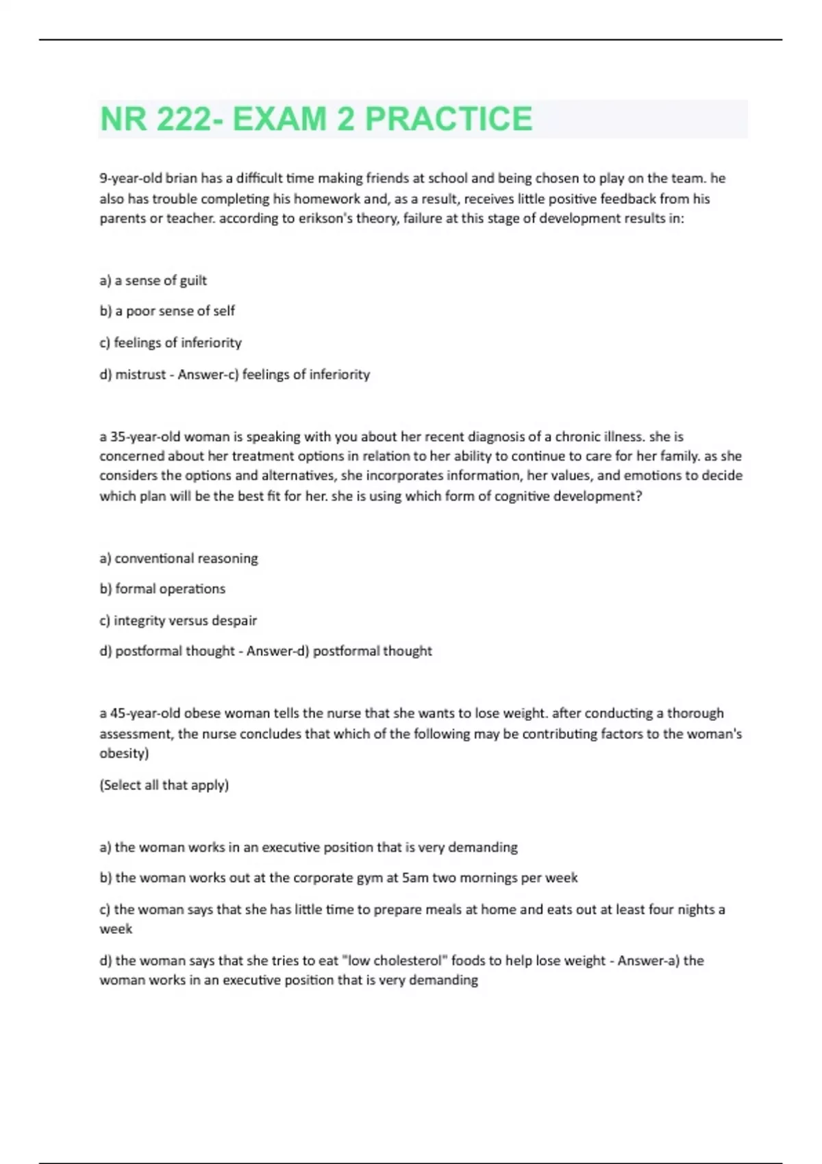 9-year-old brian has a difficult time making friends at school and being chosen to play on the team. he also has trouble completing his homework and, as a result, receives little positive feedback from his parents or teacher. according to erikson's theory, failure at this stage of development results in: a) a sense of guilt b) a poor sense of self c) feelings of inferiority d) mistrust - Answer-c) feelings of inferiority a 35-year-old woman is speaking with you about her recent diagnosis of a chronic illness. she is concerned about her treatment options in relation to her ability to continue to care for her family. as she considers the options and alternatives, she incorporates information, her values, and emotions to decide which plan will be the best fit for her. she is using which form of cognitive development? a) conventional reasoning b) formal operations c) integrity versus despair d) postformal thought - Answer-d) postformal thought a 45-year-old obese woman tells the nurse that she wants to lose weight. after conducting a thorough assessment, the nurse concludes that which of the following may be contributing factors to the woman's obesity) (Select all that apply) a) the woman works in an executive position that is very demanding b) the woman works out at the corporate gym at 5am two mornings per week c) the woman says that she has little time to prepare meals at home and eats out at least four nights a week d) the woman says that she tries to eat "low cholesterol" foods to help lose weight - Answer-a) the woman works in an executive position that is very demandingc) the woman says that she has little time to prepare meals at home and eats out at least four nights a week A 48-year-old woman complains to her nurse that she is experiencing frequent episodes of insomnia. What are some measures the nurse should educate her about? Select all that apply. a) Insomnia is common for this age group. b) Engage in activity 1 to 2 hours before bed to encourage sleep. c) Avoid or reduce the amount of caffeinated beverages that are consumed. d) Napping should be encouraged. e) Have a regular schedule for waking and sleep. - Answer-a) Insomnia is common for this age group. c) Avoid or reduce the amount of caffeinated beverages that are consumed. e) Have a regular schedule for waking and sleep.
