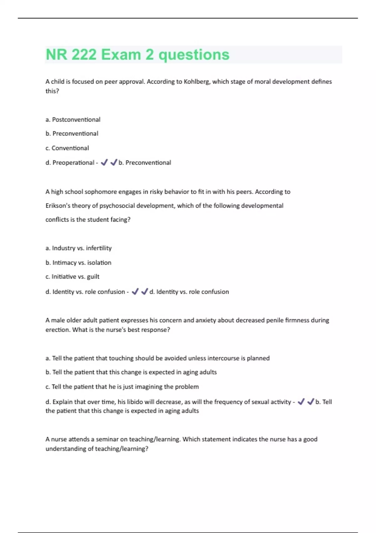 A child is focused on peer approval. According to Kohlberg, which stage of moral development defines this? a. Postconventional b. Preconventional c. Conventional d. Preoperational - b. Preconventional A high school sophomore engages in risky behavior to fit in with his peers. According to Erikson's theory of psychosocial development, which of the following developmental conflicts is the student facing? a. Industry vs. infertility b. Intimacy vs. isolation c. Initiative vs. guilt d. Identity vs. role confusion - d. Identity vs. role confusion A male older adult patient expresses his concern and anxiety about decreased penile firmness during erection. What is the nurse's best response? a. Tell the patient that touching should be avoided unless intercourse is planned b. Tell the patient that this change is expected in aging adults c. Tell the patient that he is just imagining the problem d. Explain that over time, his libido will decrease, as will the frequency of sexual activity - b. Tell the patient that this change is expected in aging adults A nurse attends a seminar on teaching/learning. Which statement indicates the nurse has a good understanding of teaching/learning?a. "Teaching is most effective when it responds to the learner's needs." b. "Teaching and learning can be separated." c. "Learning consists of a conscious, deliberate set of actions designed to help the teacher." d. "Learning is an interactive process that promotes teaching." - a. "Teaching is most effective when it responds to the learner's needs." A nurse educator need to consider this first step in the process of setting up an education program? a. Evaluate morbidity data of that population b. Evaluate health literacy of the population c. Evaluate chronic illness of that population d. Evaluate healthy behaviors of that population - b. Evaluate health literacy of the population