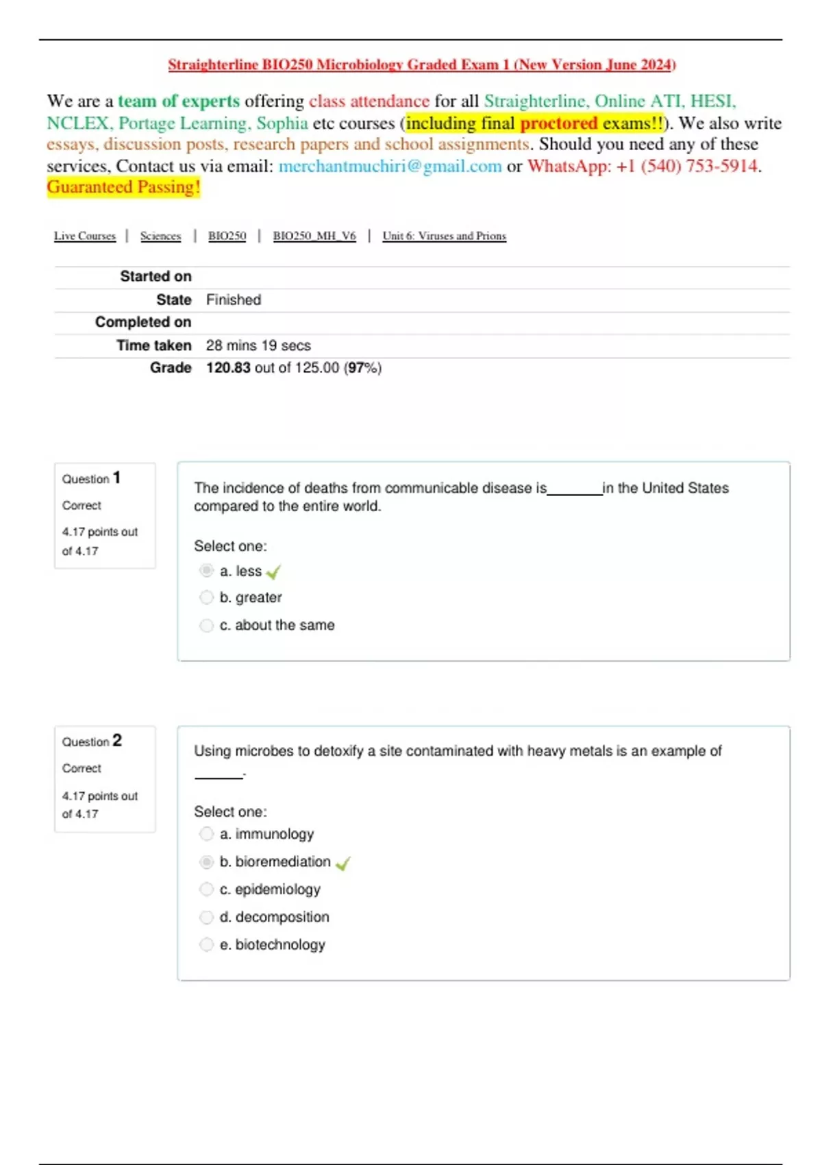 Question 1 Correct 4.17 points out of 4.17 The incidence of deaths from communicable disease is in the United States compared to the entire world. Select one: a. less b. greater c. about the same Question 2 Correct 4.17 points out of 4.17 Using microbes to detoxify a site contaminated with heavy metals is an example of . Select one: a. immunology b. bioremediation c. epidemiology d. decomposition e. biotechnology Straighterline BIO250 Microbiology Graded Exam 1 (New Version June 2024) We are a team of experts offering class attendance for all Straighterline, Online ATI, HESI, NCLEX, Portage Learning, Sophia etc courses (including final proctored exams!!). We also write essays, discussion posts, research papers and school assignments. Should you need any of these services, Contact us via email: or : +1 (540) 753-5914. Guaranteed Passing! Live Courses | Sciences | BIO250 | BIO250_MH_V6 | Unit 6: Viruses and Prions Started on State Finished Completed on Time taken 28 mins 19 secs Grade 120.83 out of 125.00 (97%)Question 4 Correct 4.17 points out of 4.17 Which area of biology states that living things undergo gradual structural and functional changes over long periods of time? Select one: a. Morphology b. Evolution c. Transformation d. Genetics e. Phylogeny Question 5 Incorrect 0.00 points out of 4.17 The first cells appeared about billion years ago. Select one: a. 2 b. 4 c. 3.5 d. 5 e. 1 The scientific method includes all of the following except . Select one: a. publication b. observation c. experimentation d. hypothesis Question 3 Correct 4.17 points out of 4.17Question 7 Correct 4.17 points out of 4.17 The orderly arrangement of organisms into a hierarchy of taxa is called . Select one: a. identification b. classification c. biotechnology d. experimentation e. nomenclature Question 8 Correct 4.17 points out of 4.17 Astrobiology is considered a sub-discipline of microbiology because . Select one: a. microbes are known to exist on other planets b. all extraterrestrials known are microbial c. only microbes can reproduce under the extreme conditions in outer space d. life elsewhere in the universe is likely to be microbial Which scientific name is written correctly? Select one: a. Staphylococcus aureus b. staphylococcus aureus c. Staphylococcusaureus d. S. aureus e. Staphylococcus aureus Question 6 Correct 4.17 points out of 4.17Question 10 Correct 4.17 points out of 4.17 Analysis of the small subunit rRNAs from all organisms in the three current domains suggests that . Select one: a. bacteria, archaea, and eukaryotes are not related b. the Archaea are more closely related to bacteria than eukaryotes c. all modern and extinct organisms on earth arose from a common ancestor d. the eukaryotes arose from prokaryotes Question 11 Correct 4.17 points out of 4.17 All cells contain . Select one: a. uracil in their DNA b. cell walls made of cellulose c. mitochondria to generate ATP d. ribosomes for protein synthesis e. organelles for compartmentalization Koch's postulates are criteria used to establish that . Select one: a. a specific microbe should be classified in a specific kingdom b. microbes can be used to clean up toxic spills c. life forms can only arise from preexisting life forms d. microbes are found on dust particles e. a specific microbe is the cause of a specific disease Question 9 Correct 4.17 points out of 4.17Question 13 Correct 4.17 points out of 4.17 Substances that release ions when dissolved in water and conduct electricity are . Select one: a. electrolytes b. covalent c. nonpolar d. solvents e. electrons Question 14 Correct 4.17 points out of 4.17 The valence number is the . Select one: a. number of electrons in the innermost orbital b. number of electrons in the outermost orbital c. atomic weight d. number of neutrons e. number of protons The building blocks of an enzyme are . Select one: a. phosphate, glycerol, and fatty acids b. glycerol and fatty acids c. nucleotides d. monosaccharides e. amino acids Question 12 Correct 4.17 points out of 4.17Question 16 Correct 4.17 points out of 4.17 The simple microscopes used by the earliest practitioners of microscopy contained which of the following? Select one: a. Oil-immersion lens b. Magnifying lens c. Lamp d. Ocular e. Condenser Question 17 Correct 4.17 points out of 4.17 All of the following are examples of different types of microbiological media except . Select one: a. enriched b. agar c. broth d. semisolid e. Petri dish A textbook uses Paramecium to illustrate several types of light microscopy.Each image is magnified 230Xand measures about 4 cm. The actual size of a Paramecium is about . Select one: a. 0.2μm b. 4,000μm c. 920μm d. 57.5μm e. 175 μm Question 15 Correct 4.17 points out of 4.17Question 19 Correct 4.17 points out of 4.17 The division of microbes termed the Mendosicuteshave a cell wall type best described as . Select one: a. gram-negative b. archaeal c. gram-positive d. lacking a cell wall Question 20 Correct 4.17 points out of 4.17 The term that refers to the presence of flagella all over the cell surface is . Select one: a. amphitrichous b. atrichous c. peritrichous d. monotrichous e. lophotrichous Which method often results in colonies developing down throughout the agar along with some colonies on the surface? Select one: a. Spread plate b. Streak plate c. Pour plate d. Replica plate Question 18 Correct 4.17 points out of 4.17Question 22 Correct 4.17 points out of 4.17 Lysozyme is most effective against . Select one: a. archaea b. gram-negative organisms c. gram-positive organisms d. cyanobacteria e. mycoplasmas Question 23 Correct 4.17 points out of 4.17 All of the following are helminths except . Select one: a. tapeworms b. flukes c. trypanosomes d. pinworms e. roundworms A clinical laboratory that identifies the bacterial agents that cause human disease would refer to Bergey's Manual of Bacteriology for guidance in identification. Select one: a. Classical b. Systematic c. Determinative d. Evolutionary Quest