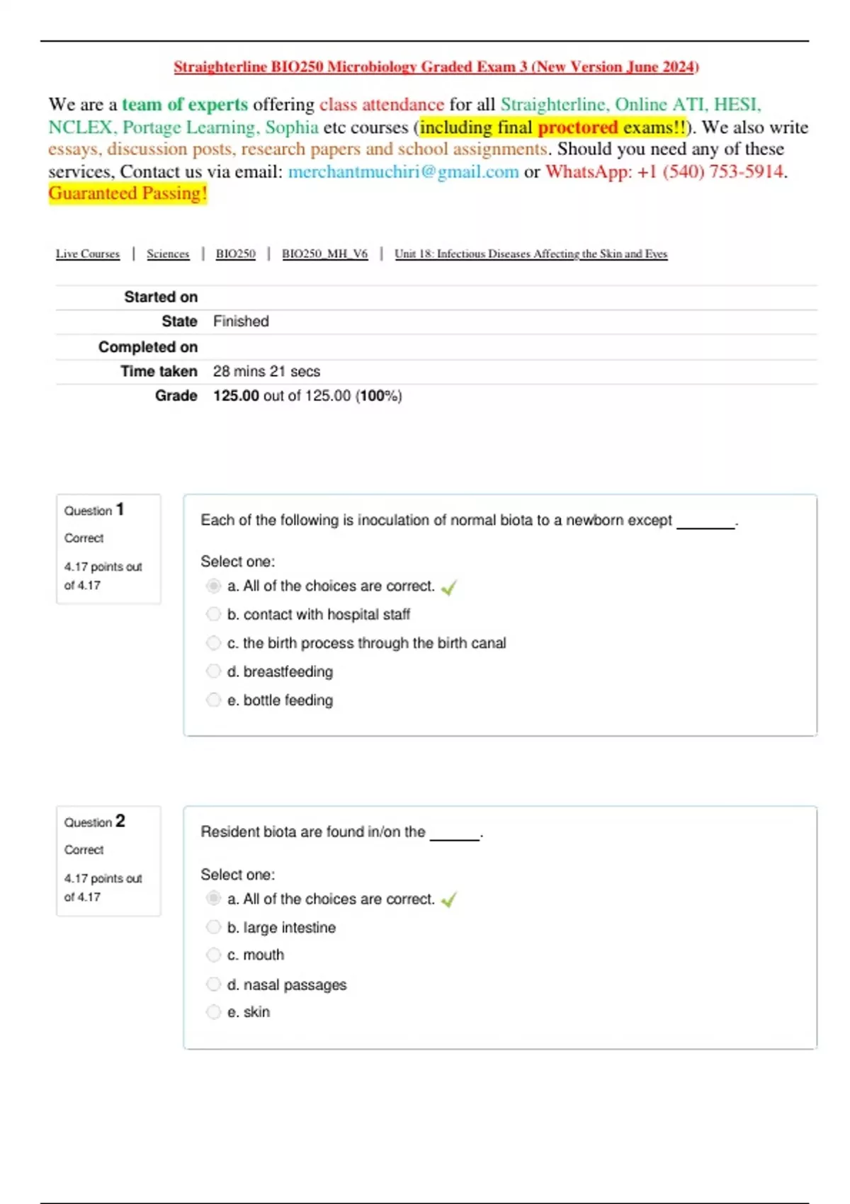 Question 1 Correct 4.17 points out of 4.17 Each of the following is inoculation of normal biota to a newborn except . Select one: a. All of the choices are correct. b. contact with hospital staff c. the birth process through the birth canal d. breastfeeding e. bottle feeding Question 2 Correct 4.17 points out of 4.17 Resident biota are found in/on the . Select one: a. All of the choices are correct. b. large intestine c. mouth d. nasal passages e. skin Straighterline BIO250 Microbiology Graded Exam 3 (New Version June 2024) We are a team of experts offering class attendance for all Straighterline, Online ATI, HESI, NCLEX, Portage Learning, Sophia etc courses (including final proctored exams!!). We also write essays, discussion posts, research papers and school assignments. Should you need any of these services, Contact us via email: or : +1 (540) 753-5914. Guaranteed Passing! Live Courses | Sciences | BIO250 | BIO250_MH_V6 | Unit 18: Infectious Diseases Affecting the Skin and Eyes Started on State Finished Completed on Time taken 28 mins 21 secs Grade 125.00 out of 125.00 (100%)Question 4 Correct 4.17 points out of 4.17 What is one goal of the Human Microbiome Project? Select one: a. To sequence the DNA of all microorganisms b. To provide comprehensive characterization of microbiota relating to human health and disease c. To study the prevalence of disease d. To elucidate genetically linked diseases e. To study microorganisms in an artificial habitat Question 5 Correct 4.17 points out of 4.17 The membrane attack stage of the complement cascade involves . Select one: a. the production of inflammatory cytokines b. initiation of the cascade c. the cleaving of C3 to yield C3a and C3b d. C1q binding to surface receptors on a membrane e. a ring-shaped protein digesting holes in bacterial cell membranes and virus envelopes Question 3 Correct 4.17 points out of 4.17 Some diseases can cause long-term or permanent damage in the patient termed . Select one: a. edema b. sequelae c. abscesses d. granulomas e. swollen lymph nodesQuestion 7 Correct 4.17 points out of 4.17 The four classic signs and symptoms of inflammation include all of the following except . Select one: a. swelling b. redness c. pain d. chills e. warmth Question 8 Correct 4.17 points out of 4.17 Plasma cells . Select one: a. are derived from T lymphocytes b. function in cell-mediated immunity c. produce and secrete antibodies d. function in blood clotting Question 6 Correct 4.17 points out of 4.17 A person will typically experience the sensation of when fever is starting to occur in the body. Select one: a. pain b. chills c. heat d. sweatingQuestion 10 Correct 4.17 points out of 4.17 During which response to the antigen do we display a latent period of no secretory antibody synthesis? Select one: a. Secondary b. Tertiary c. Primary d. Quaternary Question 11 Correct 4.17 points out of 4.17 Epinephrine . Select one: a. reverses constriction of airways b. causes desensitization c. inhibits the activity of lymphocytes d. is an antihistamine Question 9 Correct 4.17 points out of 4.17 The most abundant class of antibodies in serum is . Select one: a. IgG b. IgD c. IgM d. IgE e. IgAQuestion 13 Correct 4.17 points out of 4.17 High levels of tryptase in the blood is indicative of . Select one: a. high levels of degranulating mast cells suggesting an allergic reaction b. overuse of dietary supplements c. a viral and/or fungal infection d. a bacterial infection Question 14 Correct 4.17 points out of 4.17 Which event occurs with the sensitizing dose of allergen? Select one: a. Prostaglandins causing vasodilation and increased vascular permeability b. Binding of allergen to adjacent IgE binding sites on mast cells and basophils c. Histamine acting on smooth muscle d. Degranulation e. Binding of IgE by the Fc region to mast cells and basophils Question 12 Correct 4.17 points out of 4.17 John, a Peace Corps worker in the country of Mali in Africa, was in a car accident while traveling through a rural area. He was treated at a tiny rural hospital, and due to his loss of blood, he required a transfusion. John has B- blood type and has never received a transfusion before. Which statement is correct regarding this scenario? Select one: a. He can safely receive O- blood even though he makes anti-A antibodies. b. The preferred blood type to give John, in addition to his own B type blood, would be AB. Both types of blood have the B antigen on the cells, so they would correspond to his own antigens. As for Rh, he can receive only Rh- blood since he would have a reaction against Rh+. c. He can be given types O or B, no matter whether Rh- or Rh+. At this point in time, he does not have anti-Rh antibody. O has no antigens on the blood cells, so he is also safe to receive that type in addition to his own B type. d. He can be given A+ blood type in addition to B+. Rh- means that he makes no antibody to Rh.Question 16 Correct 4.17 points out of 4.17 An example of a secondary acquired immunodeficiency is . Select one: a. SCID b. DiGeorge syndrome c. agammaglobulinemia d. AIDS e. adenosine deaminase (ADA) deficiency Question 17 Correct 4.17 points out of 4.17 Human blood types involve all of the following except . Select one: a. inheritance of two of three possible alleles b. genetically determined glycoprotein markers c. genes that code for an enzyme that adds a terminal carbohydrate to RBC receptors d. MHC genes e. ABO antigen markers Question 15 Correct 4.17 points out of 4.17 The potential for hemolytic disease of the newborn occurs when . Select one: a. maternal Rh - cells enter an Rh + fetus b. fetal Rh - cells enter an Rh + mother c. fetal Rh + cells enter an Rh - mother d. maternal Rh + cells enter an Rh - fetus e. fetal Rh + cells enter an Rh + motherQuestion 19 Correct 4.17 points out of 4.17 When minute samples of DNA need to be genetically analyzed for identification purposes, which test can be effectively used? Select one: a. Western Blot b. Weil-Feli