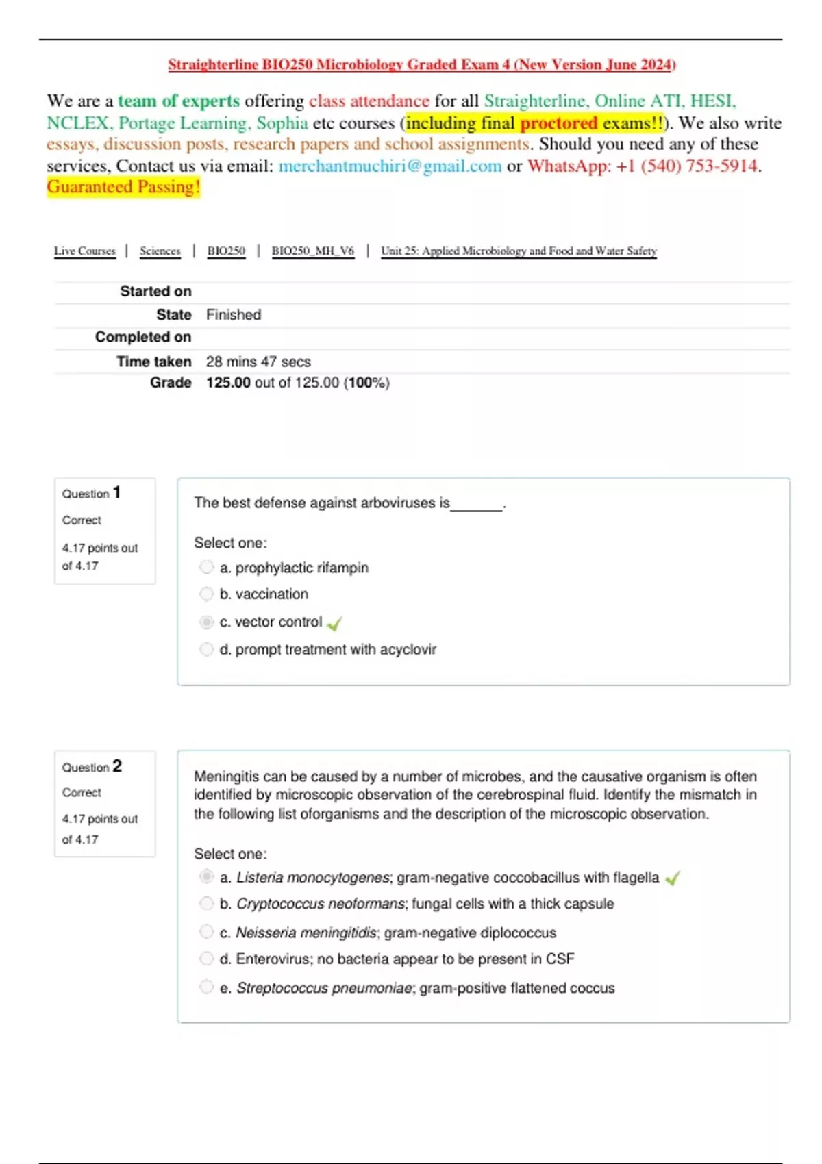 Question 1 Correct 4.17 points out of 4.17 The best defense against arboviruses is . Select one: a. prophylactic rifampin b. vaccination c. vector control d. prompt treatment with acyclovir Question 2 Correct 4.17 points out of 4.17 Meningitis can be caused by a number of microbes, and the causative organism is often identified by microscopic observation of the cerebrospinal fluid. Identify the mismatch in the following list oforganisms and the description of the microscopic observation. Select one: a. Listeria monocytogenes; gram-negative coccobacillus with flagella b. Cryptococcus neoformans; fungal cells with a thick capsule c. Neisseria meningitidis; gram-negative diplococcus d. Enterovirus; no bacteria appear to be present in CSF e. Streptococcus pneumoniae; gram-positive flattened coccus Straighterline BIO250 Microbiology Graded Exam 4 (New Version June 2024) We are a team of experts offering class attendance for all Straighterline, Online ATI, HESI, NCLEX, Portage Learning, Sophia etc courses (including final proctored exams!!). We also write essays, discussion posts, research papers and school assignments. Should you need any of these services, Contact us via email: or : +1 (540) 753-5914. Guaranteed Passing! Live Courses | Sciences | BIO250 | BIO250_MH_V6 | Unit 25: Applied Microbiology and Food and Water Safety Started on State Finished Completed on Time taken 28 mins 47 secs Grade 125.00 out of 125.00 (100%)Question 4 Correct 4.17 points out of 4.17 Which of the following statements regarding the structure of blood vessels is incorrect? Select one: a. In contrast to veins, arteries have higher blood pressure, more tissue layers, and are thinner vessels. b. Blood vessels are often found in parallel with lymphatic vessels. c. Connective tissue and muscle fibers are found in the layers of tissue surrounding both arteries and veins. d. Capillaries have only a single layer of endothelium, rendering them fragile and leaky during an infection with a hemorrhagic fever virus. Question 5 Correct 4.17 points out of 4.17 The most important defense of the cardiovascular system against infection is . Select one: a. fever b. lymphocytes in the blood c. lymph nodes d. the blood-brain barrier As a child, you received the OPVvaccine and its boosters. Now you are going on a mission trip to Pakistan, and the vaccine is recommended by the Centers for Disease Control and Prevention. When you go to the health office for the vaccine, they giveyou the IPV vaccine. When you ask why you are receiving the IPV rather than the OPV, the personnel explain that . Select one: a. the IPV has fewer active viruses in it than the OPV, soit is safer b. there is no possibility of actually developing polio from this vaccine c. IPV is used as a booster only, and OPV is used exclusively for children's first immunization d. the IPV is preferred by patients because it can be taken orally Question 3 Correct 4.17 points out of 4.17Question 7 Correct 4.17 points out of 4.17 For the following list of anti-HIV drugs and their mechanism of action. Identify the mismatch. Select one: a. Integrase inhibitor - blocks the active site of the enzyme required to splice HIV DNA into the human genome b. AZT (azidothymidine) - as an analog of thymidine, it is incorporated into viral RNA in place of thymidine c. Reverse transcriptase inhibitor - blocks the active site of the enzyme required to convert viral RNA to DNA d. Protease inhibitor - blocks the active site of the protease required for assembling new viral particles Yersinia pestis . Select one: a. is usually transmitted by a flea vector b. was virulent historically but currently circulating strains are not virulent c. has deer as an endemic reservoir d. does not respond to antimicrobial drugs Question 6 Correct 4.17 points out of 4.17Question 9 Correct 4.17 points out of 4.17 Which of the following is not a virulence factor of Bordetella pertussis? Select one: a. Endotoxin b. M protein c. Tracheal cytotoxin d. Filamentous hemagglutinin e. Pertussis toxin Question 10 Correct 4.17 points out of 4.17 Virulence factors of S. pyogenes include . Select one: a. polysaccharides on the cell wall b. spiky M proteins c. lipoteichoic acid d. hyaluronic acid capsule e. All of thechoices are correct. Following unprotected sex with a guy you met at a party, you are now worried about what you might have been exposed to during this episode. Ten days later, you talk to your doctor about getting an HIV test. What is the doctor's response? Select one: a. It's too soon to detect the antibody produced by your immune system in response to HIV exposure, so a test will come back negative. Wait a few more weeks to be tested. b. The incidence of HIV infection in the United States is at an all-time low level, so transmission was not at all likely, especially after only a single possible exposure. c. HIV infection can be latent and asymptomatic for years, so testing should be postponed until you exhibit symptoms of AIDS. d. The antibioticthat you have been taking for a urinary tract infection will also destroy HIV, so you don't have to worryabout an infection. Question 8 Correct 4.17 points out of 4.17Question 12 Correct 4.17 points out of 4.17 In addition to antimicrobials, patients with diphtheria are treated with . Select one: a. antitoxin b. heart medication c. bronchoscopy d. tracheostomy e. All of thechoices are correct. Question 13 Correct 4.17 points out of 4.17 A metagenomic study from a never-before-seen type of gingival infection indicates the presence of large numbers of archaea. Which of the following would be a good practice to isolate this organism? Select one: a. Use an anaerobic medium and incubate in a sealed container. b. Incubate the isolation medium adjacent to a bright full-spectrum light. c. Incubate the isolation medium at about 90°C. d. Adjust the pH of the medium to below 5. What features of the respiratory system protect it from infection? Select one: a. Cilia b. Mucus c. Macrophag