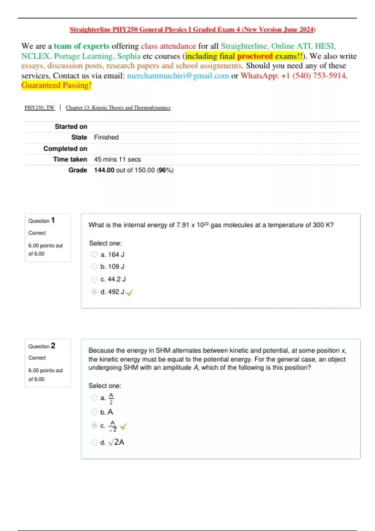 Question 1 Correct 6.00 points out of 6.00 What is the internal energy of 7.91 x 1022 gas molecules at a temperature of 300 K? Select one: a. 164 J b. 109 J c. 44.2 J d. 492 J Question 2 Correct 6.00 points out of 6.00 Because the energy in SHM alternates between kinetic and potential, at some position x, the kinetic energy must be equal to the potential energy. For the general case, an object undergoing SHM with an amplitude A, which of the following is this position? Select one: a. A 2 b. A A c. √2 d. √2A Straighterline PHY250 General Physics I Graded Exam 4 (New Version June 2024) We are a team of experts offering class attendance for all Straighterline, Online ATI, HESI, NCLEX, Portage Learning, Sophia etc courses (including final proctored exams!!). We also write essays, discussion posts, research papers and school assignments. Should you need any of these services, Contact us via email: or : +1 (540) 753-5914. Guaranteed Passing! PHY250_TW | Chapter 13: Kinetic Theory and Thermodynamics Started on State Finished Completed on Time taken 45 mins 11 secs Grade 144.00 out of 150.00 (96%)Question 4 Correct 6.00 points out of 6.00 Suppose that 10 moles of an ideal gas have a gauge pressure of 2 atm and a temperature of 200 K. If the volume of the gas is doubled and the pressure dropped to a gauge pressure of 1 atm, what is the new temperature? Select one: a. 267 K b. 300 K c. 400 K d. 200 K The filament of a light bulb has a temperature of 2580oC and radiates 60 W of power at a room temperature of 20oC. The emissivity of the filament is 0.36. What is the surface area of the filament? Select one: a. 0.44 cm2 b. 0.62 cm2 c. 0.74 cm2 d. 0.91 cm2 e. 0.144 cm2 Question 3 Correct 6.00 points out of 6.00Question 6 Correct 6.00 points out of 6.00 An ideal gas is maintained at a constant pressure of 70,000 Pa during an isobaric process and its volume decreases by 0.2 m3. What work is done by the system on its environment? Select one: a. 14,000 J b. 350,000 J c. -14,000 J d. -35,000 J Two waves are traveling side by side on two parallel ropes. Both waves are described by the function y (x, t) = 1.52 cos(0.38x + 1.41t). If the mass densities of the two ropes are 0.036 kg /m and 0.120 kg /m, what is the difference in their tensions? Select one: a. 0.0061 N b. 0.31 N c. 0.34 N d. 1.2 N Question 5 Correct 6.00 points out of 6.00Two speakers emit sinusoidal sound waves with equal amplitudes and slightly different frequencies, resulting in beats. This graph illustrates the resulting sound’s slowly-varying envelope of oscillation. Suppose the volume on one of the speakers is turned down slightly. Which of the following graphs illustrates the new envelope? The scale in all of the graphs is the same. Select one: a. b. Question 7 Correct 6.00 points out of 6.00Question 8 Correct 6.00 points out of 6.00 Which of the following best describes the relationship between two systems in thermal equilibrium? Select one: a. Both have the same amount of heat. b. The volumes are equal. c. The masses are equal. d. Both systems have zero velocity. e. None of these c. d.Question 10 Correct 6.00 points out of 6.00 If the pressure of gas is doubled and its absolute temperature is quadrupled, the volume is what factor times the original? Select one: a. 2 b. 1/2 c. 1/4 d. 4 Question 11 Correct 6.00 points out of 6.00 When rod 1 is heated by an amount ΔT, its length increases by ΔL. If rod 2, which is twice as long as rod 1, is heated by the same amount, its length increases by how much? Select one: a. ΔL b. 2ΔL c. ΔL/2 A 0.400 kg iron horseshoe that is initially at 500oC is dropped into a bucket containing 20 kg of water at 22oC. What is the final equilibrium temperature? Neglect any heat transfer to or from the surroundings. The specific heat of iron is 452 J/(kg Co). Select one: a. 23.0oC b. 24.5oC c. 21.5oC d. 26.0oC Question 9 Correct 6.00 points out of 6.00Question 13 Correct 6.00 points out of 6.00 If A is the amplitude of a mass on an oscillating spring, then in one period the mass travels a distance of . Select one: a. 0 b. A c. 2A d. 4A Question 14 Correct 6.00 points out of 6.00 What is the outside temperature if 16 x 106 J of heat is lost through a 2.00 m2 pane of 0.250 cm thick glass (kglass = 0.840 W/(m K) ) in 45 min from a house kept at 21.8oC? Select one: a. 0oC b. 4oC c. 13oC d. 24oC e. 28oC What happens to a given mass of water when it is cooled from 8oC to 4oC? Select one: a. It contracts. b. It expands. c. It vaporizes. d. It does not expand, vaporize, or contract. Question 12 Correct 6.00 points out of 6.00Question 16 Correct 6.00 points out of 6.00 Suppose a damping force Fd = −bv, where v is the velocity, is applied to an oscillatory system. Which of the following is the unit of the coefficient b? Select one: a. N (newton) b. kg /s c. m /s d. kg /m Question 17 Correct 6.00 points out of 6.00 Two sinusoidal waves of amplitude 5.71 m and frequency 2.5 Hz are traveling in the same direction on the same rope. If they are 17∘out of phase, what is the amplitude of the resting wave? Select one: a. 11 m b. 5.5 m c. 6.9 m d. 9.2 m A heat engine operates in a Carnot cycle between 80oC and 350oC. It receives 21,000 J of energy per cycle from the hot reservoir. The duration of each cycle is 1.00 s. What is the mechanical power of this engine? Select one: a. 21 kW b. 910 kW c. 9.10 kW d. 120 kW Question 15 Correct 6.00 points out of 6.00Question 19 Correct 6.00 points out of 6.00 The pressure in a tank of nitrogen is 1.75 x 107 Pa at 20oC. If the nitrogen occupies 30 m3 at 1 atm and 20oC, find the volume of the tank. Select one: a. 0.174 m3 b. 0.287 m3 c. 0.304 m3 d. 0.356 m3 Question 20 Correct 6.00 points out of 6.00 What is the efficiency of a Carnot engine operating between 100oC and 0oC? Select one: a. 7% b. 15% c. 27% d. 51% The Ideal Gas law is given by which equation? (n is the number of moles of the gas) Select one: a. P = nRT b. PV = nRT c. PT = nRV d. PV=RT Question 18 Incorrect 0.00 points