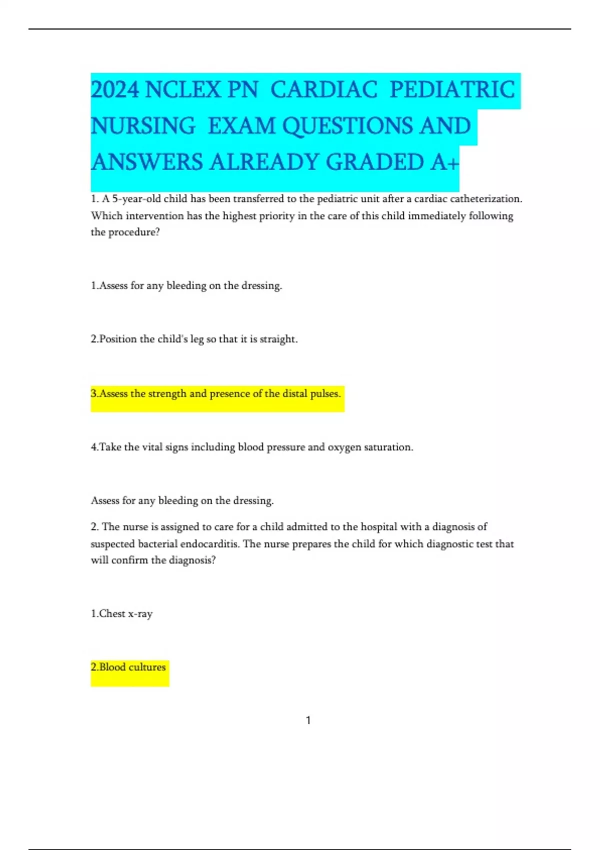 2024 NCLEX PN CARDIAC PEDIATRIC NURSING EXAM QUESTIONS AND ANSWERS ALREADY GRADED A+