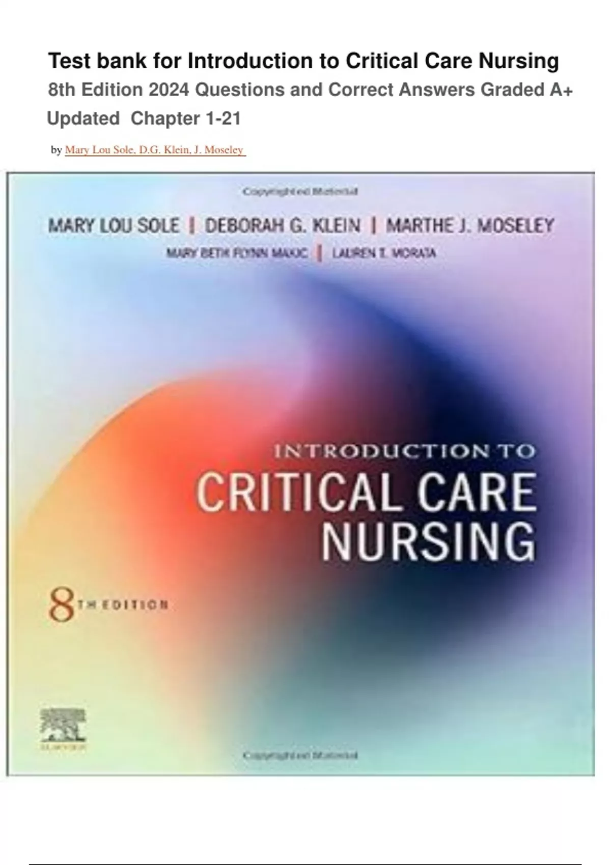 Test bank for Introduction to Critical Care Nursing 8th Edition 2024 Questions and Correct Answers Graded A+ Updated Chapter 1-21 by Mary Lou Sole, D.G. Klein, J. Moseley