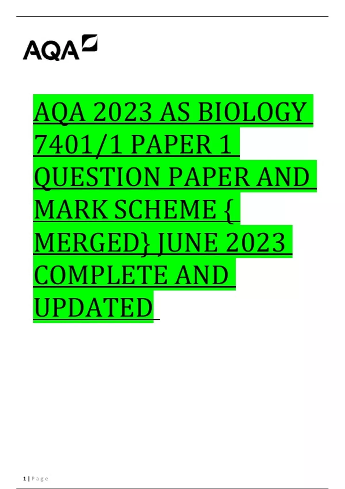 AQA 2023 AS BIOLOGY 7401/1 PAPER 1 QUESTION PAPER AND MARK SCHEME { MERGED} JUNE 2023 COMPLETE AND UPDATED