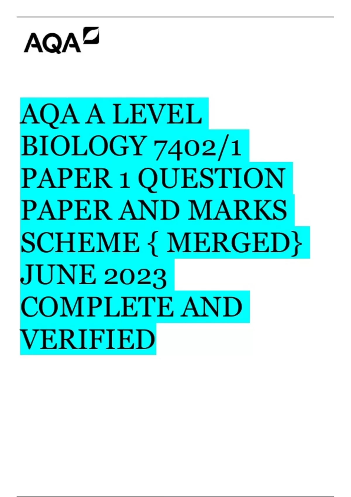 AQA A LEVEL BIOLOGY 7402/1 PAPER 1 QUESTION PAPER AND MARKS SCHEME { MERGED} JUNE 2023 COMPLETE AND VERIFIED