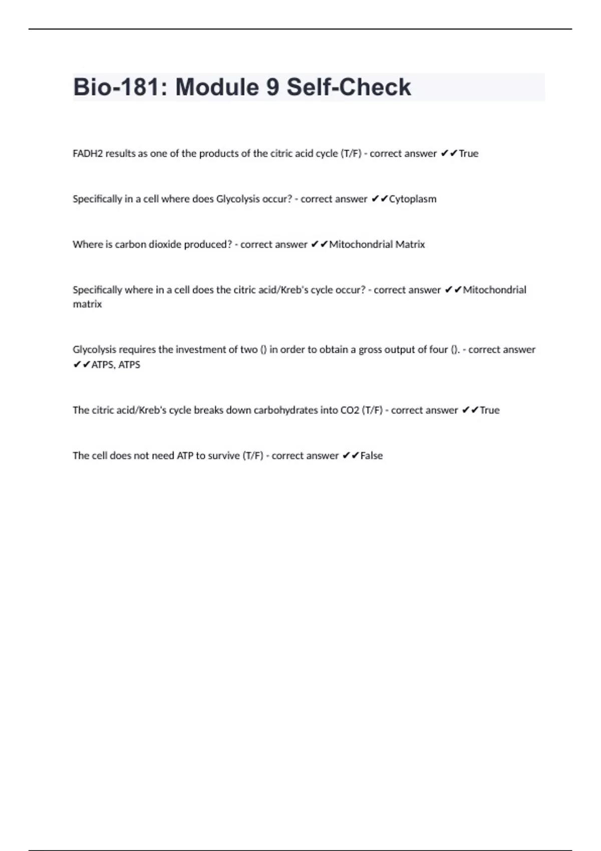 Bio-181: Module 9 Self-Check FADH2 results as one of the products of the citric acid cycle (T/F) - correct answer True Specifically in a cell where does Glycolysis occur? - correct answer Cytoplasm Where is carbon dioxide produced? - correct answer Mitochondrial Matrix Specifically where in a cell does the citric acid/Kreb's cycle occur? - correct answer Mitochondrial matrix Glycolysis requires the investment of two () in order to obtain a gross output of four (). - correct answer ATPS, ATPS The citric acid/Kreb's cycle breaks down carbohydrates into CO2 (T/F) - correct answer True The cell does not need ATP to survive (T/F) - correct answer False