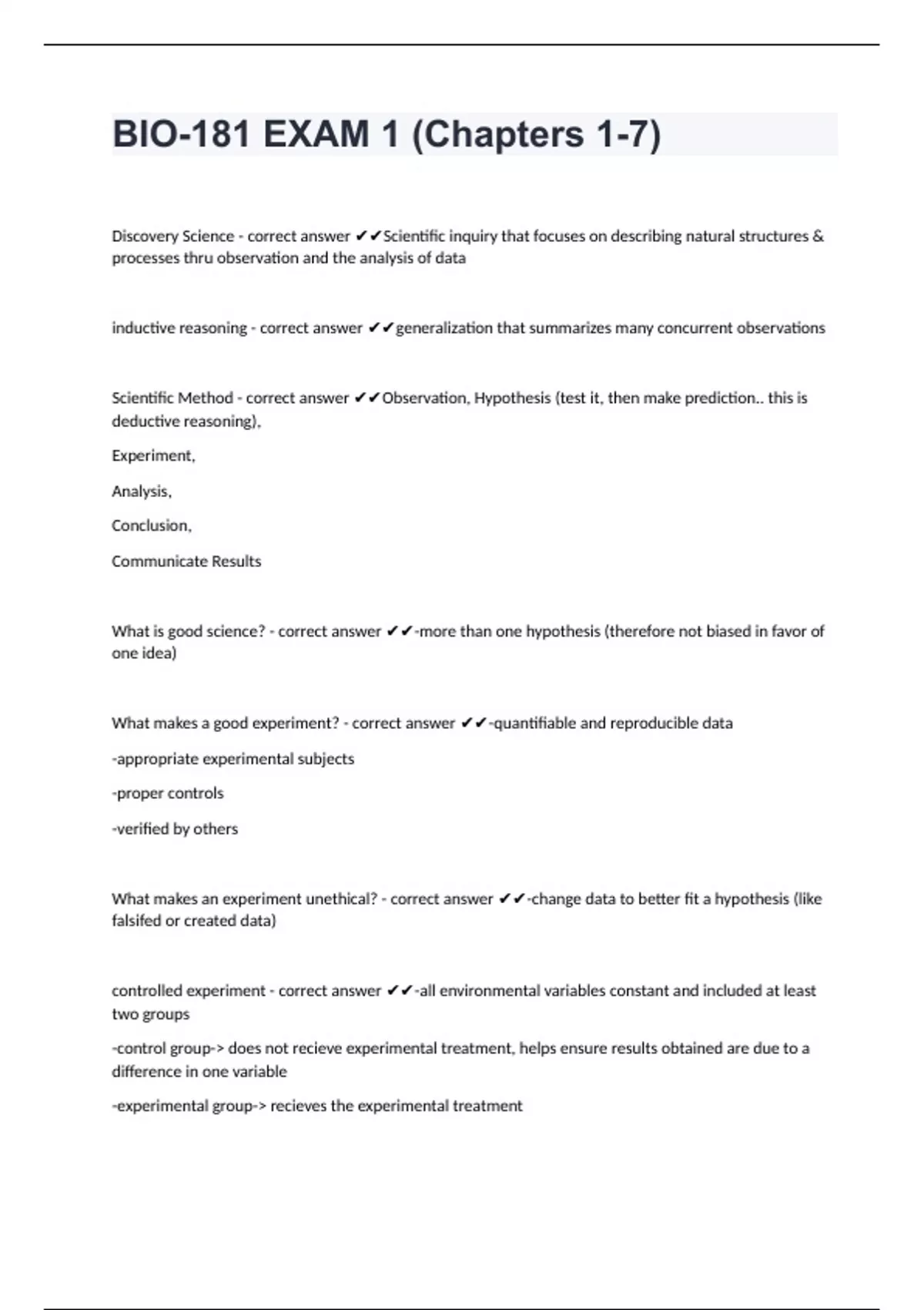 BIO-181 EXAM 1 (Chapters 1-7)Discovery Science - correct answer Scientific inquiry that focuses on describing natural structures & processes thru observation and the analysis of data inductive reasoning - correct answer generalization that summarizes many concurrent observations Scientific Method - correct answer Observation, Hypothesis (test it, then make prediction.. this is deductive reasoning), Experiment, Analysis, Conclusion, Communicate Results What is good science? - correct answer -more than one hypothesis (therefore not biased in favor of one idea) What makes a good experiment? - correct answer -quantifiable and reproducible data -appropriate experimental subjects -proper controls -verified by others What makes an experiment unethical? - correct answer -change data to better fit a hypothesis (like falsifed or created data) controlled experiment - correct answer -all environmental variables constant and included at least two groups -control group-> does not recieve experimental treatment, helps ensure results obtained are due to a difference in one variable