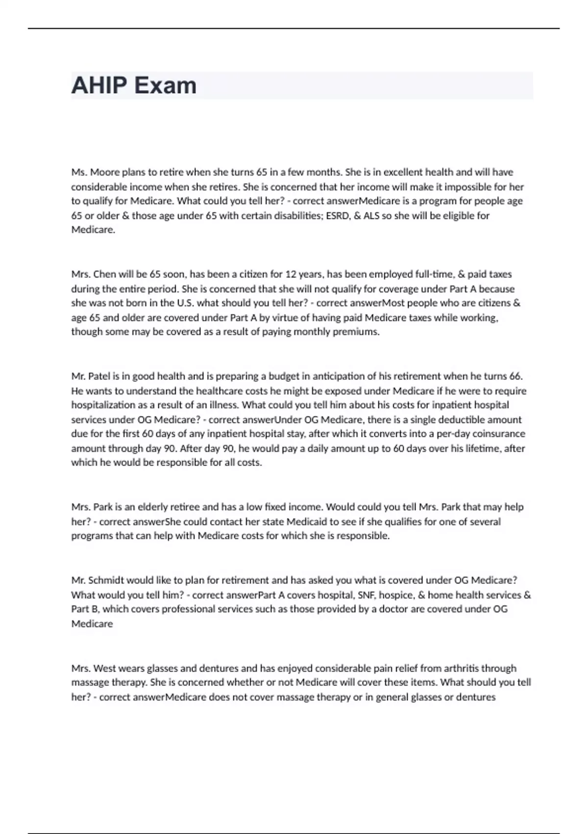 Ms. Moore plans to retire when she turns 65 in a few months. She is in excellent health and will have considerable income when she retires. She is concerned that her income will make it impossible for her to qualify for Medicare. What could you tell her? - correct answerMedicare is a program for people age 65 or older & those age under 65 with certain disabilities; ESRD, & ALS so she will be eligible for Medicare. Mrs. Chen will be 65 soon, has been a citizen for 12 years, has been employed full-time, & paid taxes during the entire period. She is concerned that she will not qualify for coverage under Part A because she was not born in the U.S. what should you tell her? - correct answerMost people who are citizens & age 65 and older are covered under Part A by virtue of having paid Medicare taxes while working, though some may be covered as a result of paying monthly premiums. Mr. Patel is in good health and is preparing a budget in anticipation of his retirement when he turns 66. He wants to understand the healthcare costs he might be exposed under Medicare if he were to require hospitalization as a result of an illness. What could you tell him about his costs for inpatient hospital services under OG Medicare? - correct answerUnder OG Medicare, there is a single deductible amount due for the first 60 days of any inpatient hospital stay, after which it converts into a per-day coinsurance amount through day 90. After day 90, he would pay a daily amount up to 60 days over his lifetime, after which he would be responsible for all costs. Mrs. Park is an elderly retiree and has a low fixed income. Would could you tell Mrs. Park that may help her? - correct answerShe could contact her state Medicaid to see if she qualifies for one of several programs that can help with Medicare costs for which she is responsible. Mr. Schmidt would like to plan for retirement and has asked you what is covered under OG Medicare? What would you tell him? - correct answerPart A covers hospital, SNF, hospice, & home health services & Part B, which covers professional services such as those provided by a doctor are covered under OG Medicare Mrs. West wears glasses and dentures and has enjoyed considerable pain relief from arthritis through massage therapy. She is concerned whether or not Medicare will cover these items. What should you tell her? - correct answerMedicare does not cover massage therapy or in general glasses or dentures