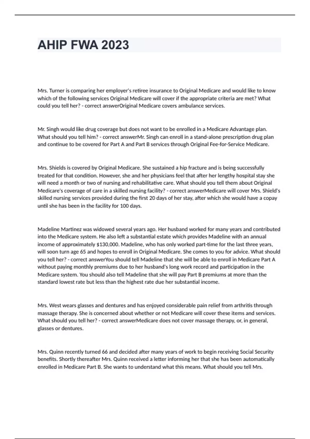 Mrs. Turner is comparing her employer's retiree insurance to Original Medicare and would like to know which of the following services Original Medicare will cover if the appropriate criteria are met? What could you tell her? - correct answerOriginal Medicare covers ambulance services. Mr. Singh would like drug coverage but does not want to be enrolled in a Medicare Advantage plan. What should you tell him? - correct answerMr. Singh can enroll in a stand-alone prescription drug plan and continue to be covered for Part A and Part B services through Original Fee-for-Service Medicare. Mrs. Shields is covered by Original Medicare. She sustained a hip fracture and is being successfully treated for that condition. However, she and her physicians feel that after her lengthy hospital stay she will need a month or two of nursing and rehabilitative care. What should you tell them about Original Medicare's coverage of care in a skilled nursing facility? - correct answerMedicare will cover Mrs. Shield's skilled nursing services provided during the first 20 days of her stay, after which she would have a copay until she has been in the facility for 100 days. Madeline Martinez was widowed several years ago. Her husband worked for many years and contributed into the Medicare system. He also left a substantial estate which provides Madeline with an annual income of approximately $130,000. Madeline, who has only worked part-time for the last three years, will soon turn age 65 and hopes to enroll in Original Medicare. She comes to you for advice. What should you tell her? - correct answerYou should tell Madeline that she will be able to enroll in Medicare Part A without paying monthly premiums due to her husband's long work record and participation in the Medicare system. You should also tell Madeline that she will pay Part B premiums at more than the standard lowest rate but less than the highest rate due her substantial income. Mrs. West wears glasses and dentures and has enjoyed considerable pain relief from arthritis through massage therapy. She is concerned about whether or not Medicare will cover these items and services. What should you tell her? - correct answerMedicare does not cover massage therapy, or, in general, glasses or dentures. Mrs. Quinn recently turned 66 and decided after many years of work to begin receiving Social Security benefits. Shortly thereafter Mrs. Quinn received a letter informing her that she has been automatically enrolled in Medicare Part B. She wants to understand what this means. What should you tell Mrs.