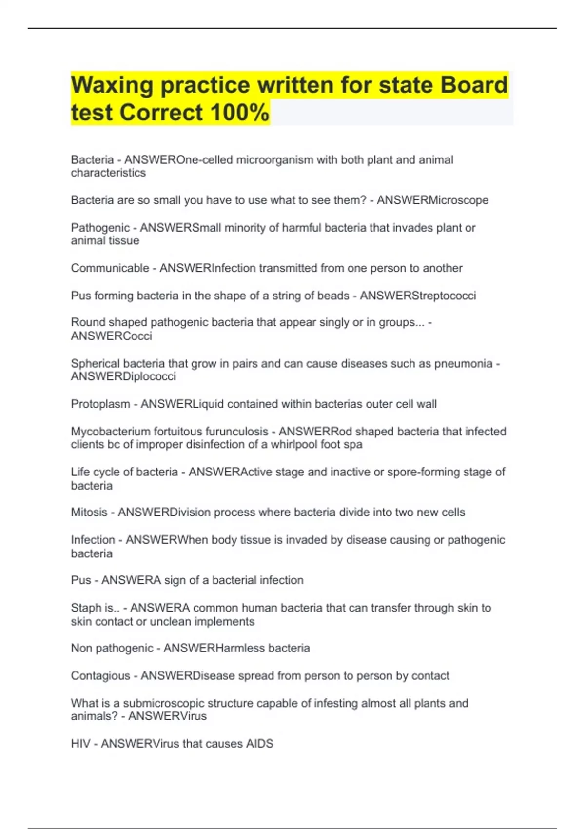 Bacteria - ANSWEROne-celled microorganism with both plant and animal characteristics Bacteria are so small you have to use what to see them? - ANSWERMicroscope Pathogenic - ANSWERSmall minority of harmful bacteria that invades plant or animal tissue Communicable - ANSWERInfection transmitted from one person to another Pus forming bacteria in the shape of a string of beads - ANSWERStreptococci Round shaped pathogenic bacteria that appear singly or in groups... - ANSWERCocci Spherical bacteria that grow in pairs and can cause diseases such as pneumonia - ANSWERDiplococci Protoplasm - ANSWERLiquid contained within bacterias outer cell wall Mycobacterium fortuitous furunculosis - ANSWERRod shaped bacteria that infected clients bc of improper disinfection of a whirlpool foot spa Life cycle of bacteria - ANSWERActive stage and inactive or spore-forming stage of bacteria Mitosis - ANSWERDivision process where bacteria divide into two new cells Infection - ANSWERWhen body tissue is invaded by disease causing or pathogenic bacteria Pus - ANSWERA sign of a bacterial infection Staph is.. - ANSWERA common human bacteria that can transfer through skin to skin contact or unclean implements Non pathogenic - ANSWERHarmless bacteria Contagious - ANSWERDisease spread from person to person by contact What is a submicroscopic structure capable of infesting almost all plants and animals? - ANSWERVirus HIV - ANSWERVirus that causes AIDS