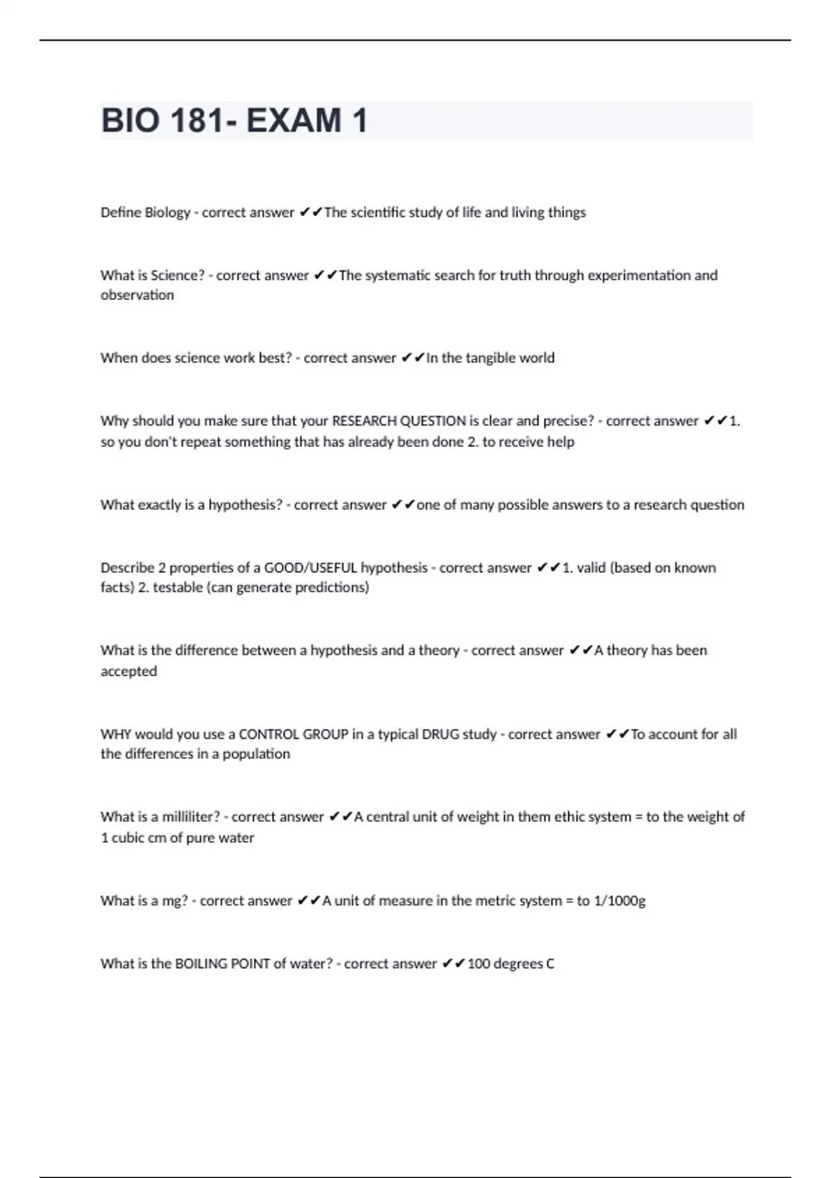 BIO 181- EXAM 1Define Biology - correct answer The scientific study of life and living things What is Science? - correct answer The systematic search for truth through experimentation and observation When does science work best? - correct answer In the tangible world Why should you make sure that your RESEARCH QUESTION is clear and precise? - correct answer 1. so you don't repeat something that has already been done 2. to receive help What exactly is a hypothesis? - correct answer one of many possible answers to a research question Describe 2 properties of a GOOD/USEFUL hypothesis - correct answer 1. valid (based on known facts) 2. testable (can generate predictions) What is the difference between a hypothesis and a theory - correct answer A theory has been accepted WHY would you use a CONTROL GROUP in a typical DRUG study - correct answer To account for all the differences in a population What is a milliliter? - correct answer A central unit of weight in them ethic system = to the weight of 1 cubic cm of pure water What is a mg? - correct answer A unit of measure in the metric system = to 1/1000g What is the BOILING POINT of water? - correct answer 100 degrees C