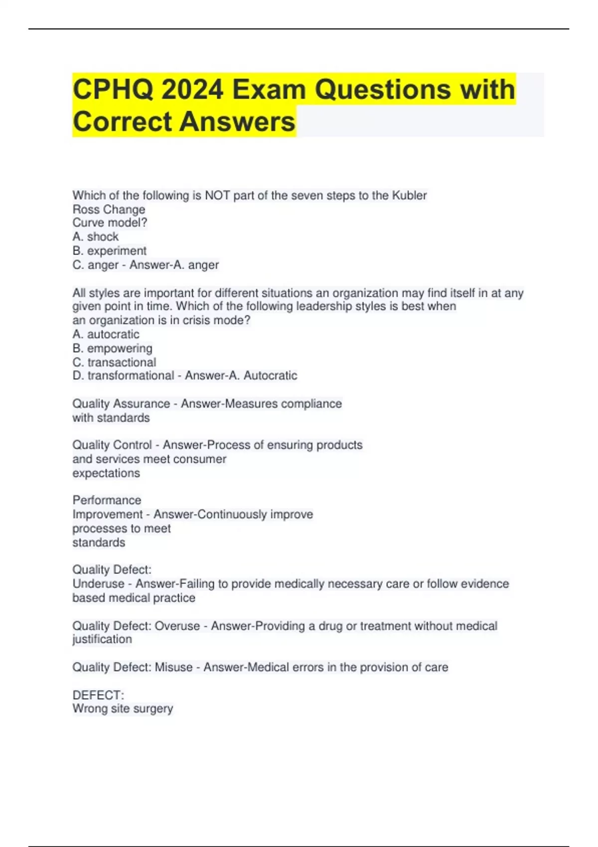 CPHQ 2024 Exam Questions with Correct Answers Which of the following is NOT part of the seven steps to the Kubler Ross Change Curve model? A. shock B. experiment C. anger - Answer-A. anger All styles are important for different situations an organization may find itself in at any given point in time. Which of the following leadership styles is best when an organization is in crisis mode? A. autocratic B. empowering C. transactional D. transformational - Answer-A. Autocratic Quality Assurance - Answer-Measures compliance with standards Quality Control - Answer-Process of ensuring products and services meet consumer expectations Performance Improvement - Answer-Continuously improve processes to meet standards Quality Defect: Underuse - Answer-Failing to provide medically necessary care or follow evidence based medical practice Quality Defect: Overuse - Answer-Providing a drug or treatment without medical justification Quality Defect: Misuse - Answer-Medical errors in the provision of care DEFECT: Wrong site surgery A. Underuse Failing to provide medically necessary care or follow evidence based medical practice B. Overuse Providing a drug or treatment without medical justification C. Misuse Medical errors in the provision of care - Answer-C. Misuse DEFECT: Use of high tech imaging (MRI, CAT scan) when other diagnostic tests are sufficient A. Underuse Failing to provide medically necessary care or follow evidence based medical practice B. Overuse Providing a drug or treatment without medical justification C. Misuse Medical errors in the provision of care - Answer-B. Overuse