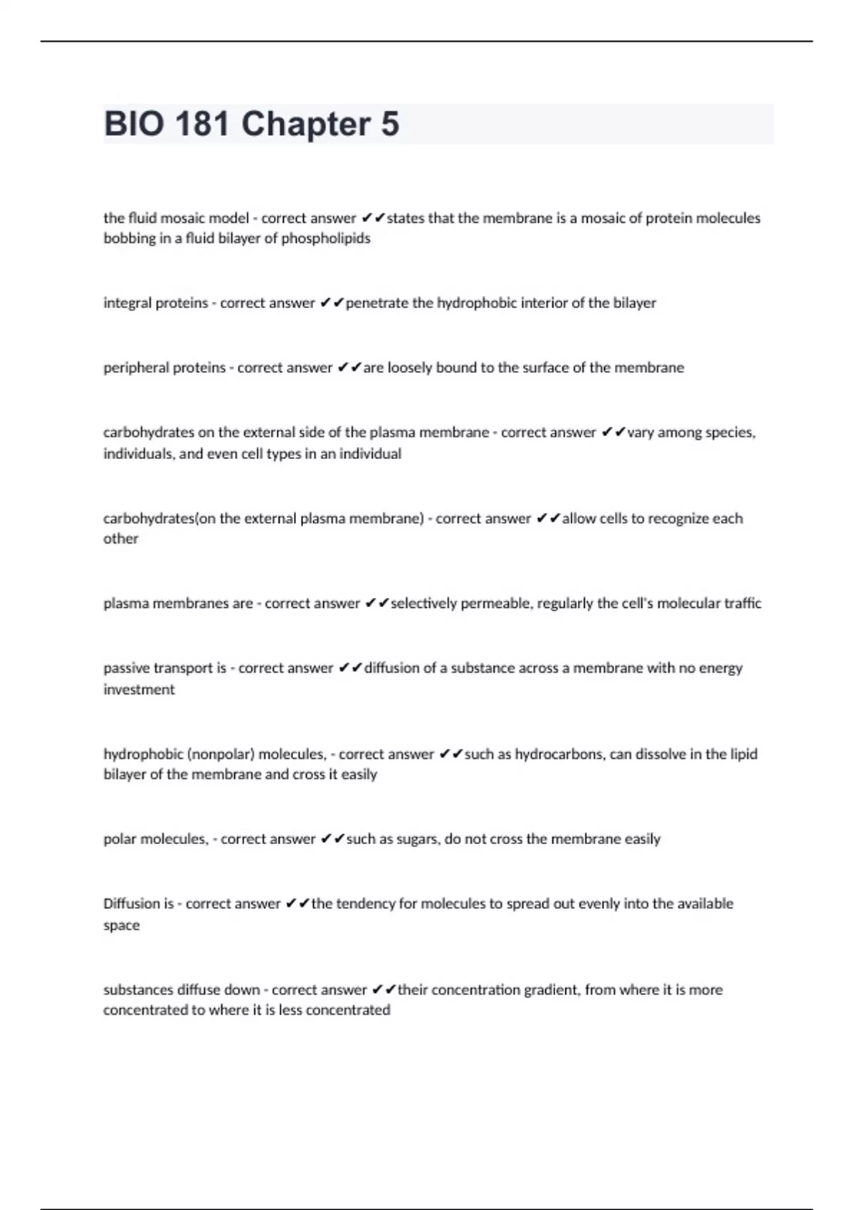 BIO 181 Chapter 5the fluid mosaic model - correct answer states that the membrane is a mosaic of protein molecules bobbing in a fluid bilayer of phospholipids integral proteins - correct answer penetrate the hydrophobic interior of the bilayer peripheral proteins - correct answer are loosely bound to the surface of the membrane carbohydrates on the external side of the plasma membrane - correct answer vary among species, individuals, and even cell types in an individual carbohydrates(on the external plasma membrane) - correct answer allow cells to recognize each other plasma membranes are - correct answer selectively permeable, regularly the cell's molecular traffic passive transport is - correct answer diffusion of a substance across a membrane with no energy investment hydrophobic (nonpolar) molecules, - correct answer such as hydrocarbons, can dissolve in the lipid bilayer of the membrane and cross it easily polar molecules, - correct answer such as sugars, do not cross the membrane easily Diffusion is - correct answer the tendency for molecules to spread out evenly into the available space substances diffuse down - correct answer their concentration gradient, from where it is more concentrated to where it is less concentrated