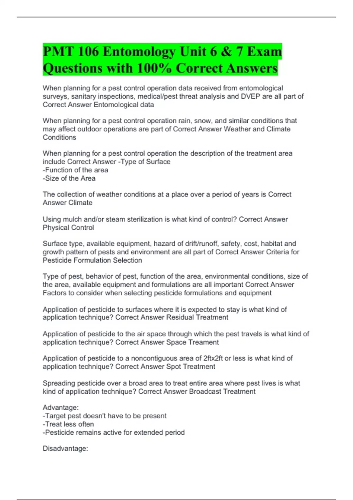 PMT 106 Entomology Unit 6 & 7 Exam Questions with 100% Correct Answers