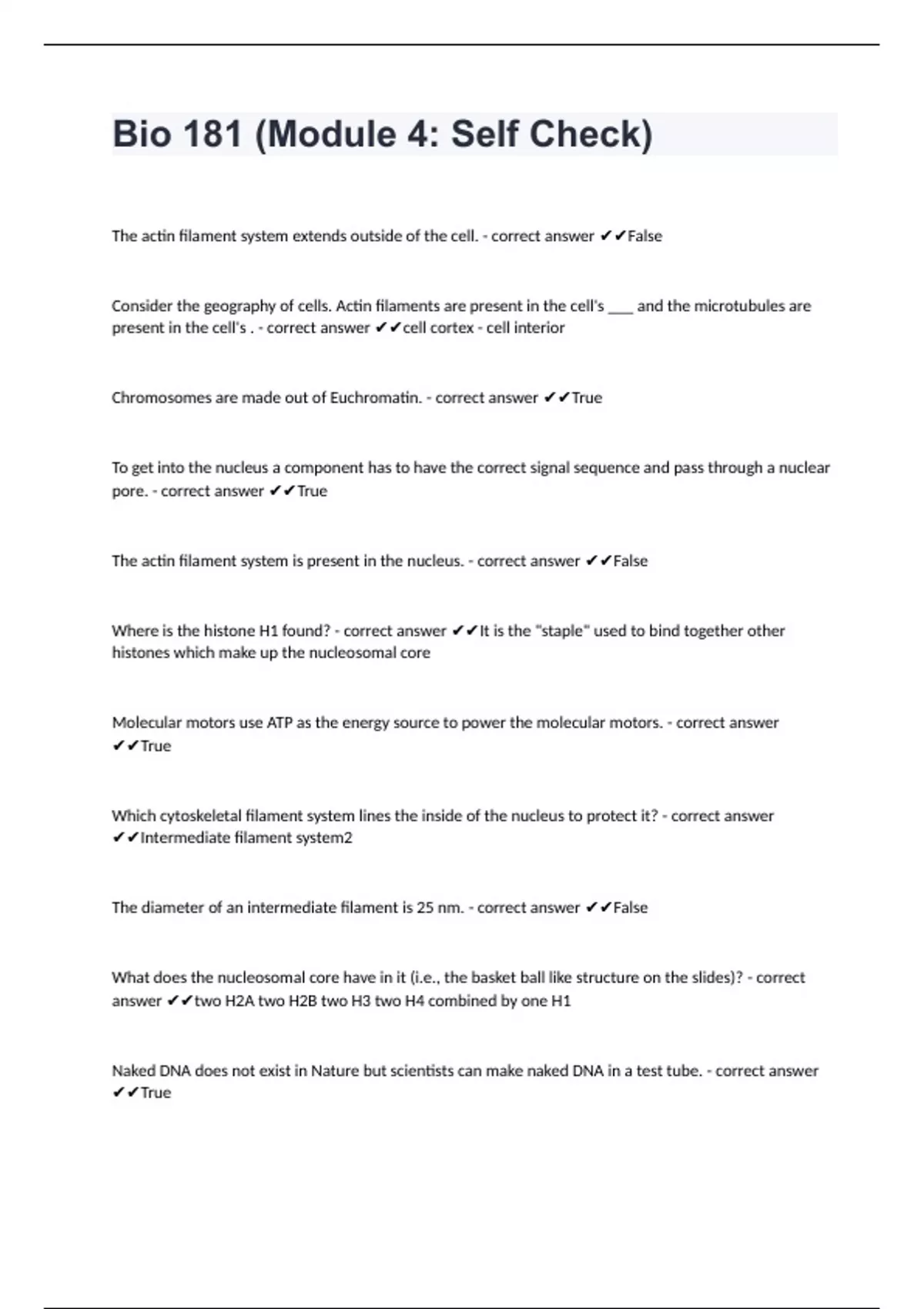 Bio 181 (Module 4: Self Check)The actin filament system extends outside of the cell. - correct answer False Consider the geography of cells. Actin filaments are present in the cell's ___ and the microtubules are present in the cell's . - correct answer cell cortex - cell interior Chromosomes are made out of Euchromatin. - correct answer True To get into the nucleus a component has to have the correct signal sequence and pass through a nuclear pore. - correct answer True The actin filament system is present in the nucleus. - correct answer False Where is the histone H1 found? - correct answer It is the "staple" used to bind together other histones which make up the nucleosomal core Molecular motors use ATP as the energy source to power the molecular motors. - correct answer True Which cytoskeletal filament system lines the inside of the nucleus to protect it? - correct answer Intermediate filament system2 The diameter of an intermediate filament is 25 nm. - correct answer False What does the nucleosomal core have in it (i.e., the basket ball like structure on the slides)? - correct answer two H2A two H2B two H3 two H4 combined by one H1